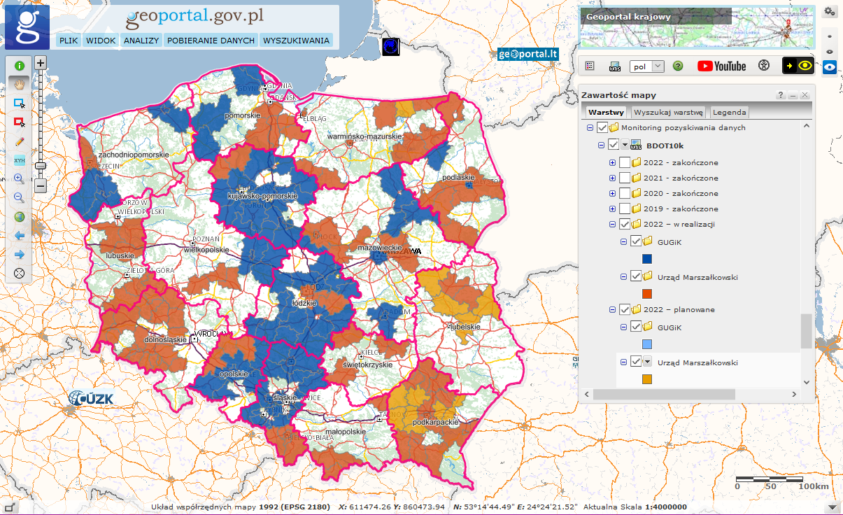 Informacje o statusie prac dotyczących aktualizacji bazy danych obiektów topograficznych, realizowanych obecnie przez GUGiK oraz Urzędy Marszałkowskie, można uzyskać w serwisie https://mapy.geoportal.gov.pl/ w warstwie „Monitoring pozyskiwania danych → BDOT10k”.
