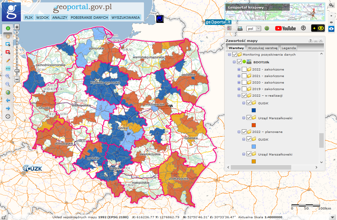 Informacje o statusie prac dotyczących aktualizacji bazy danych obiektów topograficznych, realizowanych obecnie przez GUGiK oraz Urzędy Marszałkowskie, można uzyskać w serwisie https://mapy.geoportal.gov.pl/ w warstwie „Monitoring pozyskiwania danych - BDOT10k”.