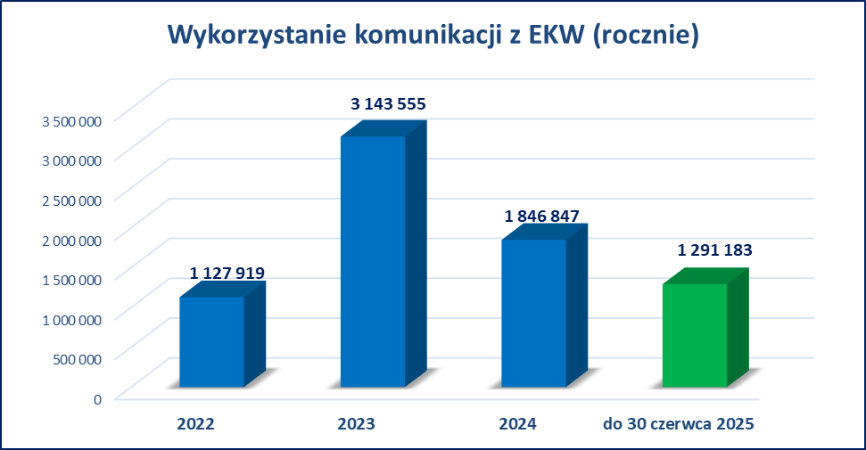 - przesłanych zostało ponad 1,6 mln zawiadomień z eKW do EGiB. Funkcjonalność została uruchomiona we wszystkich starostwach, dlatego liczba przesyłanych zawiadomień w postaci dokumentów elektronicznych wciąż wzrasta;