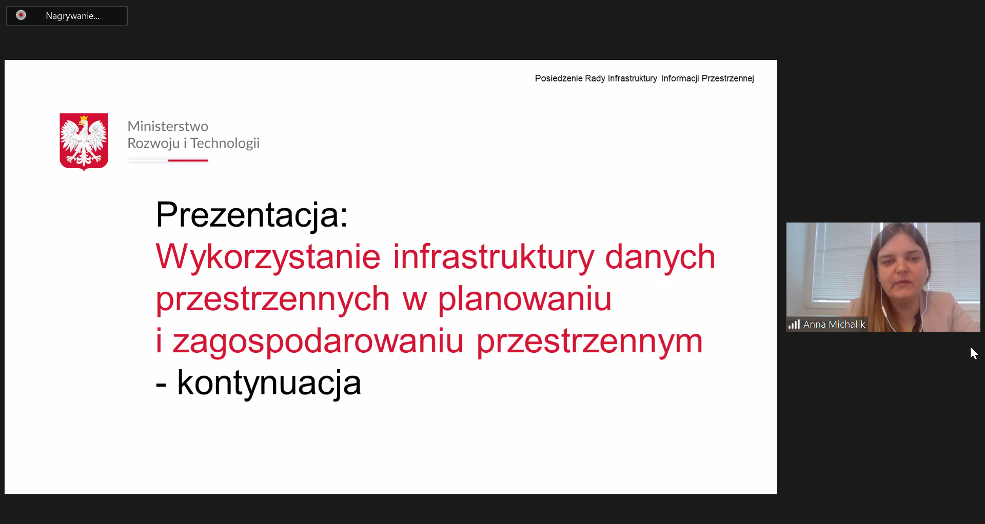 Anna Michalik, zastępca dyrektora Departamentu Planowania Przestrzennego w Ministerstwie Rozwoju i Technologii, kontynuowała temat z ostatniego spotkania „Wykorzystanie infrastruktury danych przestrzennych w zagospodarowaniu przestrzennym”. Mówiła m.in. o obecnych działaniach podejmowanych w zakresie cyfryzacji miejscowych planów zagospodarowania przestrzennego - prekonsultacjach reformy planowania przestrzennego.