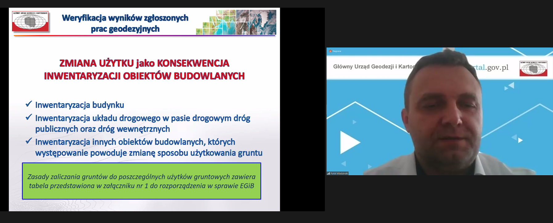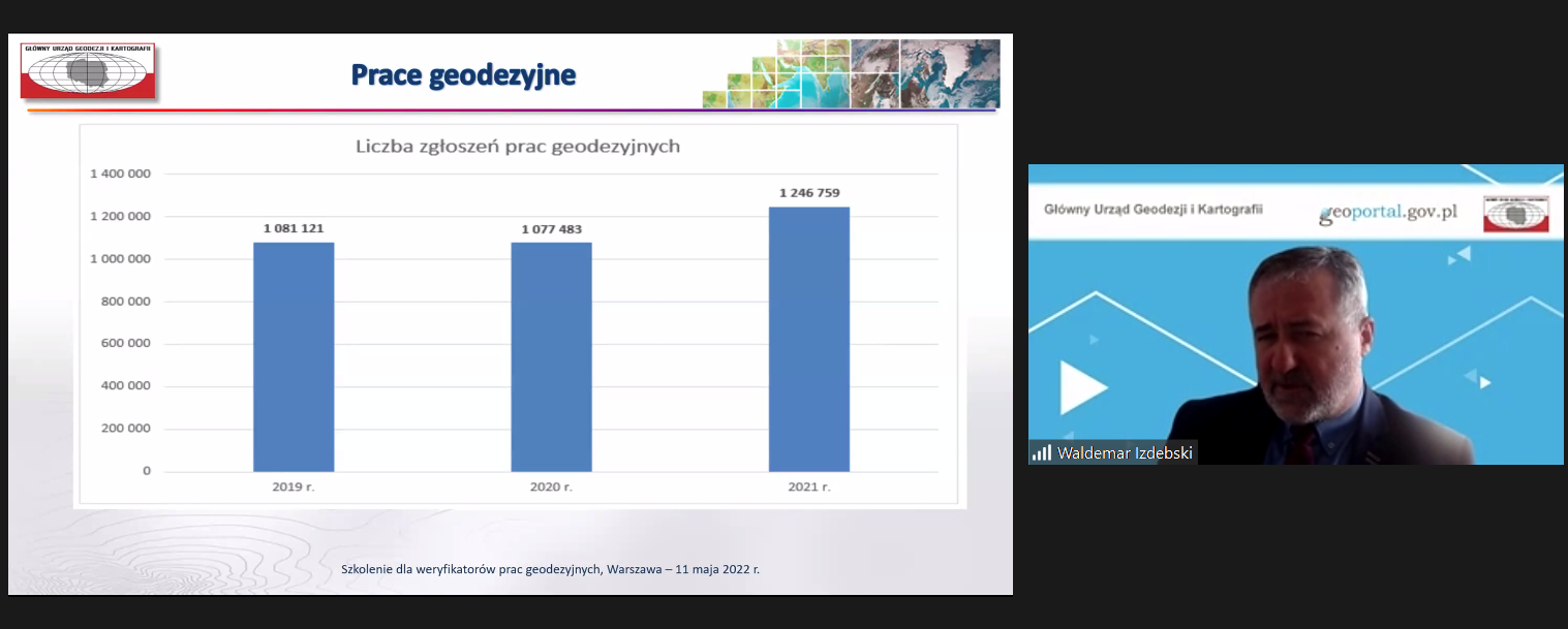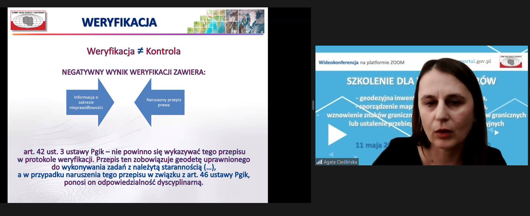 Wideokonferencja „Szkolenie dla weryfikatorów” została zorganizowana 11 maja 2022 r. Spotkanie rozpoczął Główny Geodeta Kraju dr hab. inż. Waldemar Izdebski ogólnym wprowadzeniem w tematykę weryfikacji. Natomiast w głównej części szkolenia Agata Cieślińska z Głównego Urzędu Geodezji i Kartografii poruszała między innymi takie tematy, jak: geodezyjna inwentaryzacja powykonawcza, sporządzenie mapy do celów projektowych, wznowienie znaków granicznych i wyznaczenie punktów granicznych lub ustalenie przebiegu granic działek ewidencyjnych.
