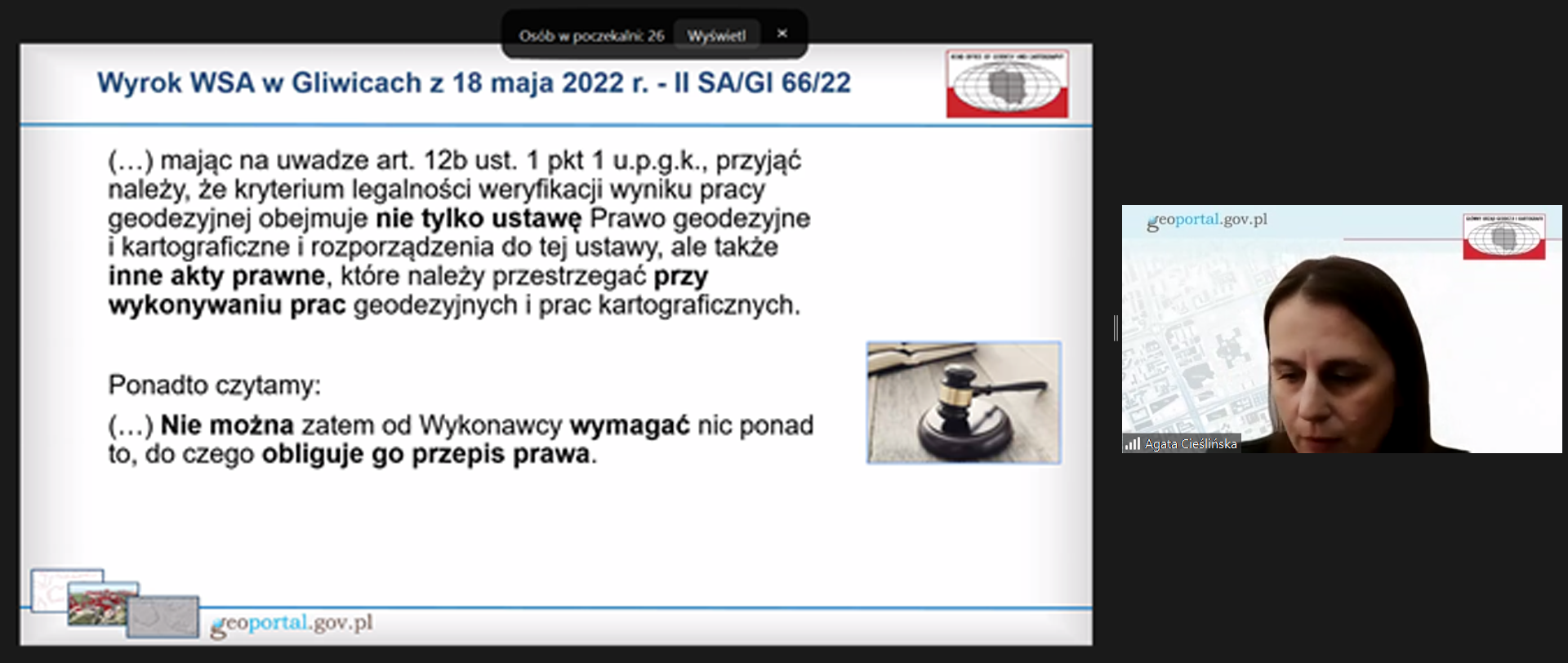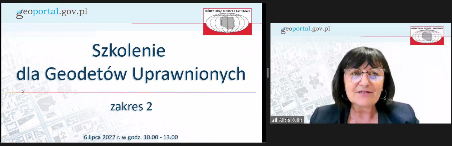 W związku z dużym zainteresowaniem szkoleniami Głównego Urzędu Geodezji i Kartografii 6 lipca 2022 r. została zorganizowana zapowiedziana na „Szkoleniu dla weryfikatorów” przez p.o. Głównego Geodetę Kraju Alicję Kulkę wideokonferencja „Szkolenie dla Geodetów Uprawnionych – zakres 2”. Spotkanie rozpoczęła p.o. Główny Geodeta Kraju Alicja Kulka, która zapowiedziała, że szkolenie jest pierwszym z cyklu organizowanych przez urząd dla różnych grup zawodowych zajmujących się geodezją i kartografią. W głównej części szkolenia Agata Cieślińska z Głównego Urzędu Geodezji i Kartografii szczegółowo omawiała tematy rozgraniczania i podziału nieruchomości (gruntów) oraz sporządzania dokumentacji do celów prawnych.