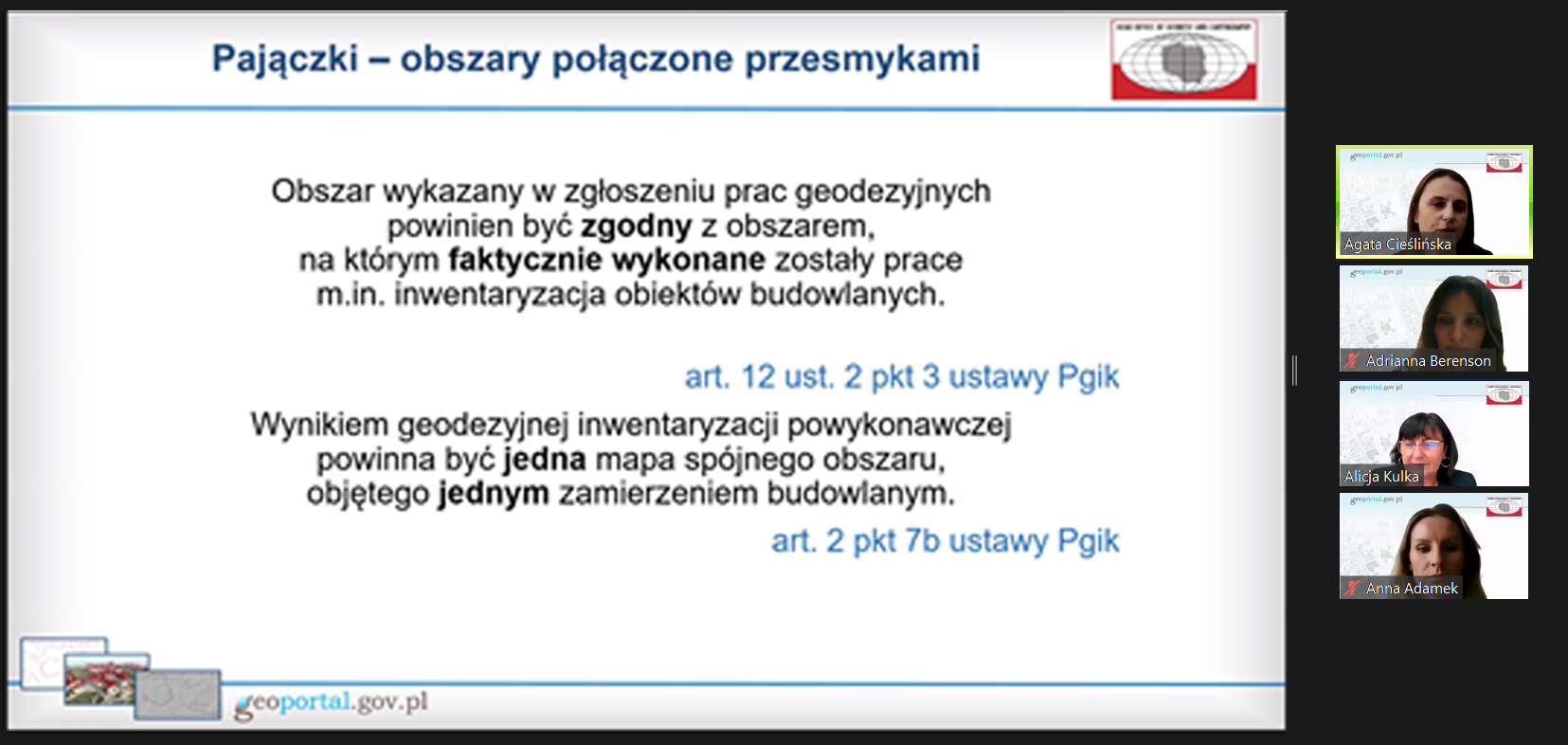 Spotkanie zakończyła sesja pytań i odpowiedzi, na które udzielali odpowiedzi: p.o. Główny Geodeta Kraju Alicja Kulka, Dyrektor Departamentu Nadzoru, Kontroli i Organizacji Służby Geodezyjnej i Kartograficznej Adrianna Berenson oraz prowadząca szkolenie Agata Cieślińska.