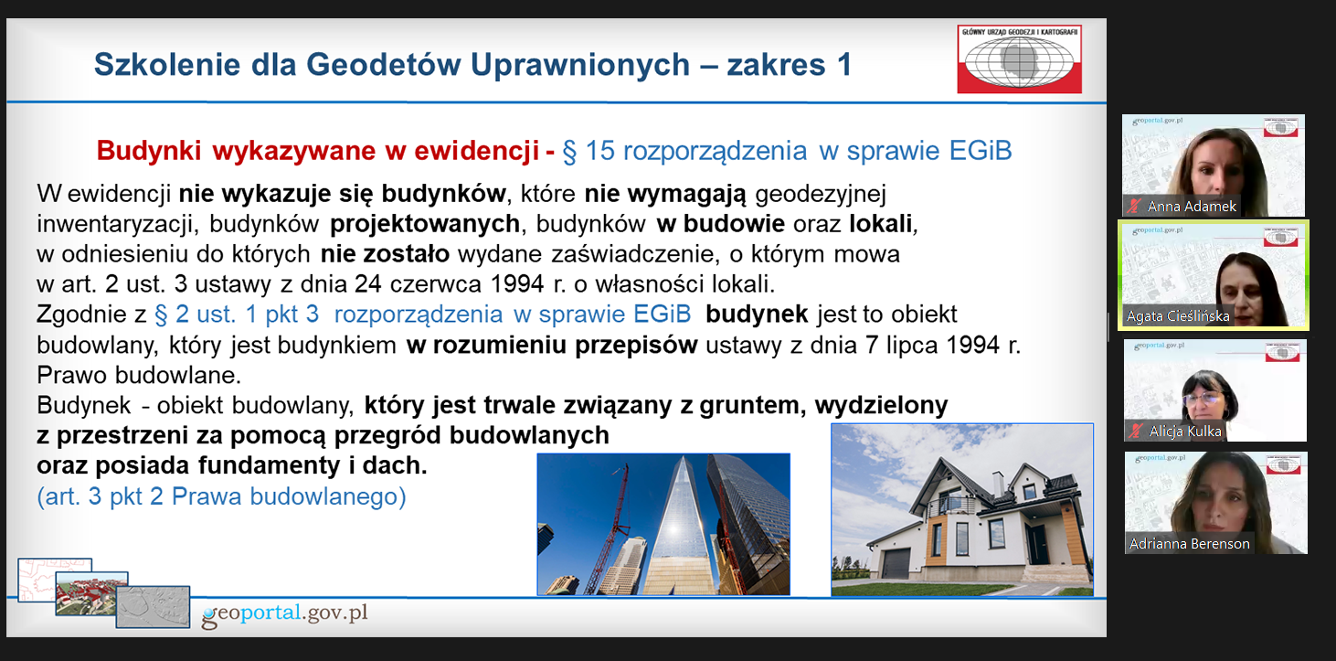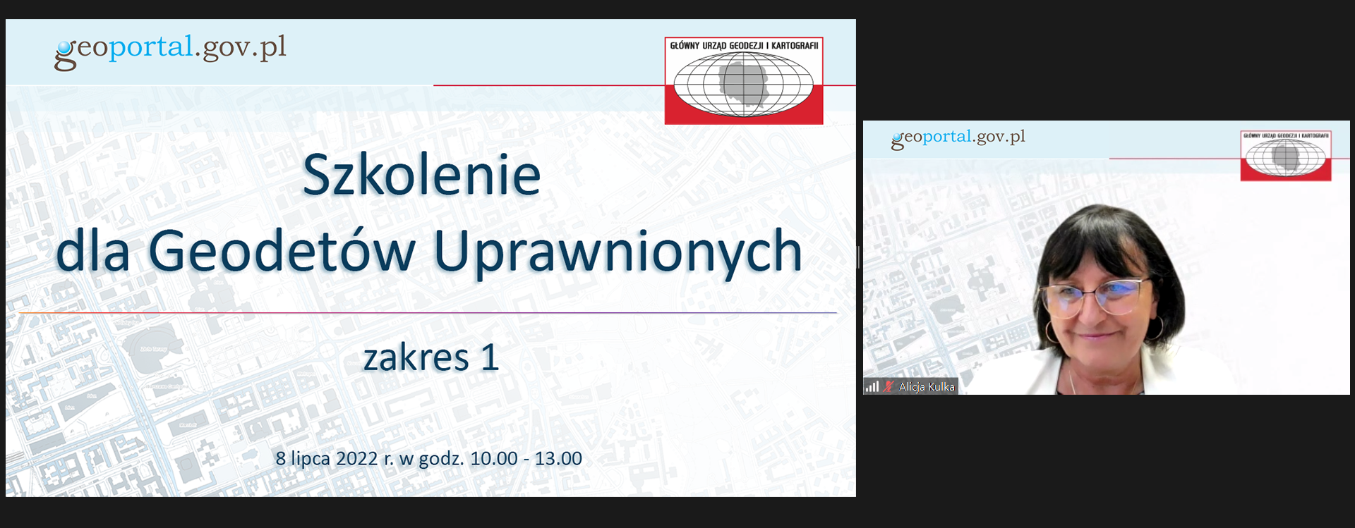 Kolejne szkolenie dla Geodetów Uprawnionych zorganizowane przez Główny Urząd Geodezji i Kartografii 8 lipca 2022 r. cieszyło się dużą popularnością – uczestniczyło w nim niemal 750 osób. Prowadząca spotkanie Agata Cieślińska (Geodeta Uprawniony – zakres 1 i 2) uczestnikom wideokonferencji „Szkolenie dla Geodetów Uprawnionych – zakres 1” szczegółowo przybliżyła problematykę geodezyjnych pomiarów sytuacyjno-wysokościowych, realizacyjnych i inwentaryzacyjnych, odpowiadając na wiele pytań przesyłanych do Głównego Urzędu Geodezji i Kartografii.