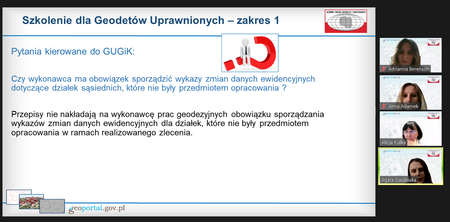 Spotkanie zakończyła sesja pytań, na które odpowiedzi udzielały: p.o. Główny Geodeta Kraju Alicja Kulka, Dyrektor Departamentu Nadzoru, Kontroli i Organizacji Służby Geodezyjnej i Kartograficznej Adrianna Berenson, Zastępca Dyrektora Departamentu Informacji o Nieruchomościach Aneta Seremet oraz prowadząca szkolenie Agata Cieślińska.