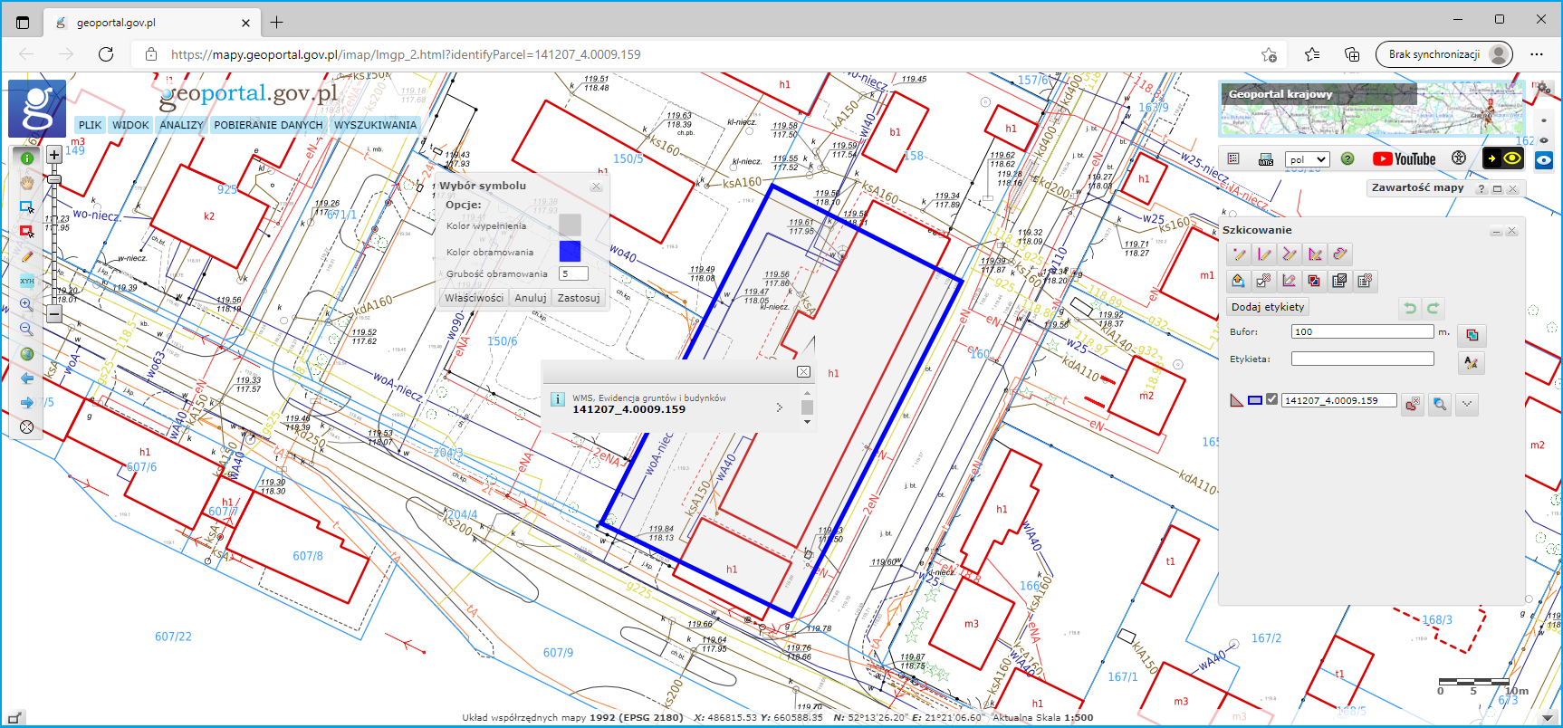 widzimy zaznaczoną działkę, a po uruchomieniu narzędzia szkicownik (ilustracja powyżej) możemy dowolnie zmienić jej prezentację graficzną.
