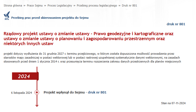 Rząd przyjął i skierował do Sejmu projekt nowelizacji ustawy Prawo geodezyjne i kartograficzne, który wydłuża do 31 grudnia 2027 r. termin prowadzenia przez starostów mapy zasadniczej w postaci wektorowej lub rastrowej na zasadach obowiązujących przed 1 stycznia 2014 r.