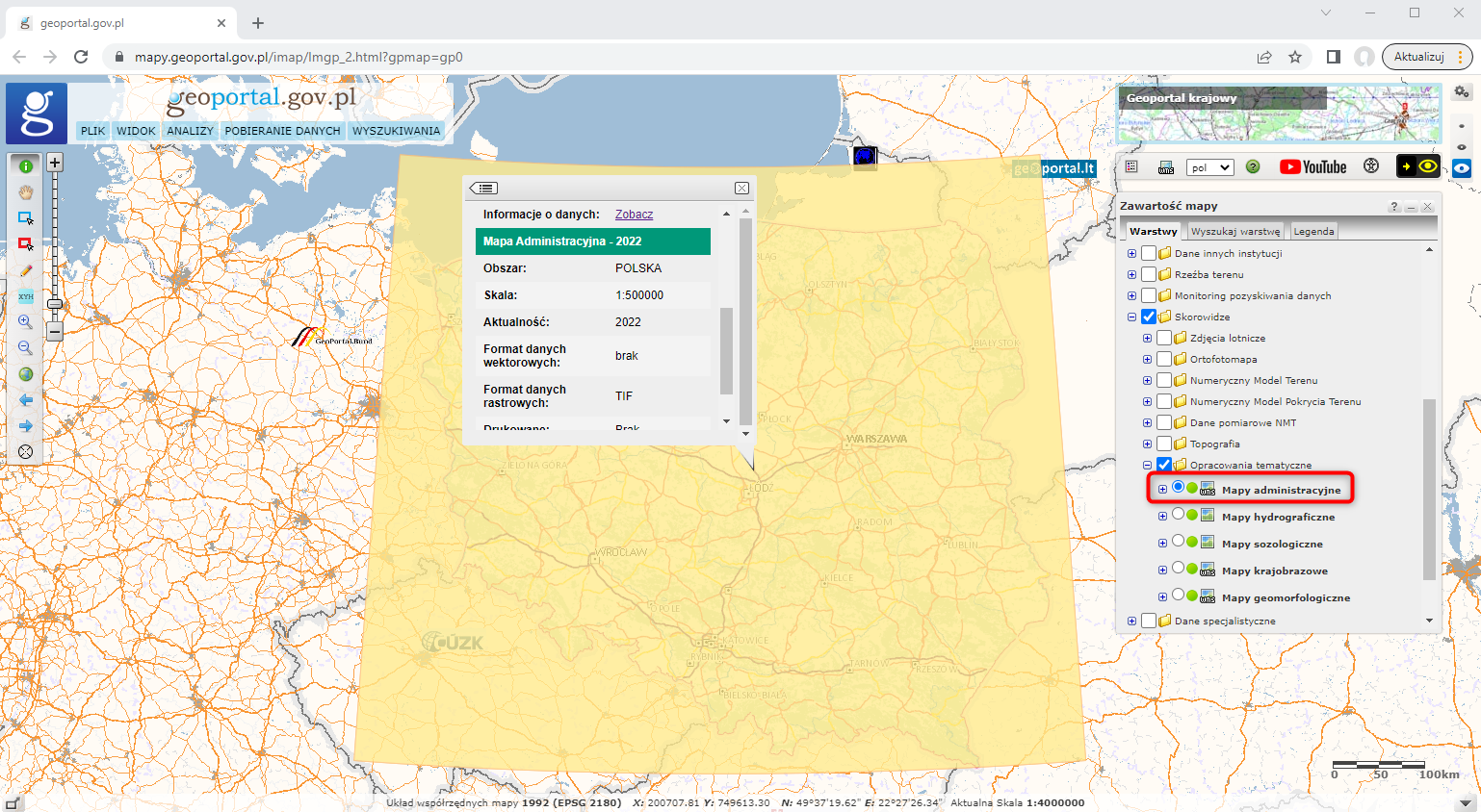 W serwisie www.geoportal.gov.pl w grupie warstw „Skorowidze” – „Opracowania tematyczne” dodaliśmy skorowidze map administracyjnych prezentujące dostępne w centralnym zasobie geodezyjnym i kartograficznym mapy administracyjne Polski wraz z podstawowymi informacjami: