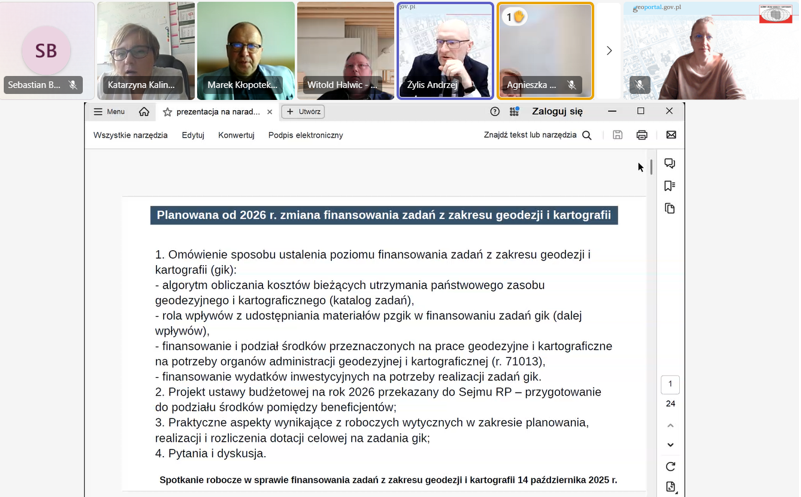 Podczas spotkania zostały poruszone planowane od 2026 r. zmiany finansowania zadań z zakresu geodezji i kartografii. Omówiono sposób ustalenia poziomu finansowania zadań, projekt ustawy budżetowej na rok 2026 oraz praktyczne aspekty wynikające z roboczych wytycznych w zakresie planowania, realizacji i rozliczenia dotacji celowej na zadania z zakresu geodezji i kartografii.