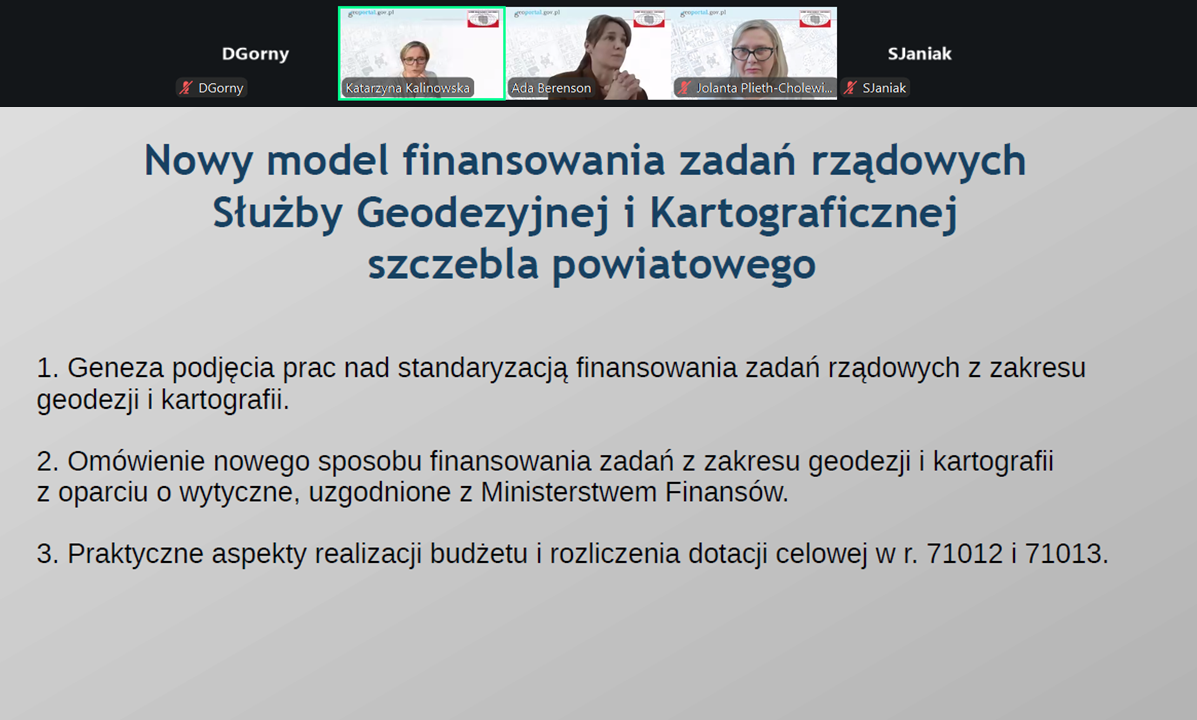 Podczas spotkania zostały omówione ogólne zagadnienia związane z dotowaniem zadań zleconych na zadania z geodezji i kartografii oraz zaplanowane od 2026 r. zmiany finansowania zadań z zakresu geodezji i kartografii. Głównym celem spotkania było omówienie wytycznych w zakresie planowania, realizacji i rozliczenia dotacji celowej na zadania geodezyjne i kartograficzne.