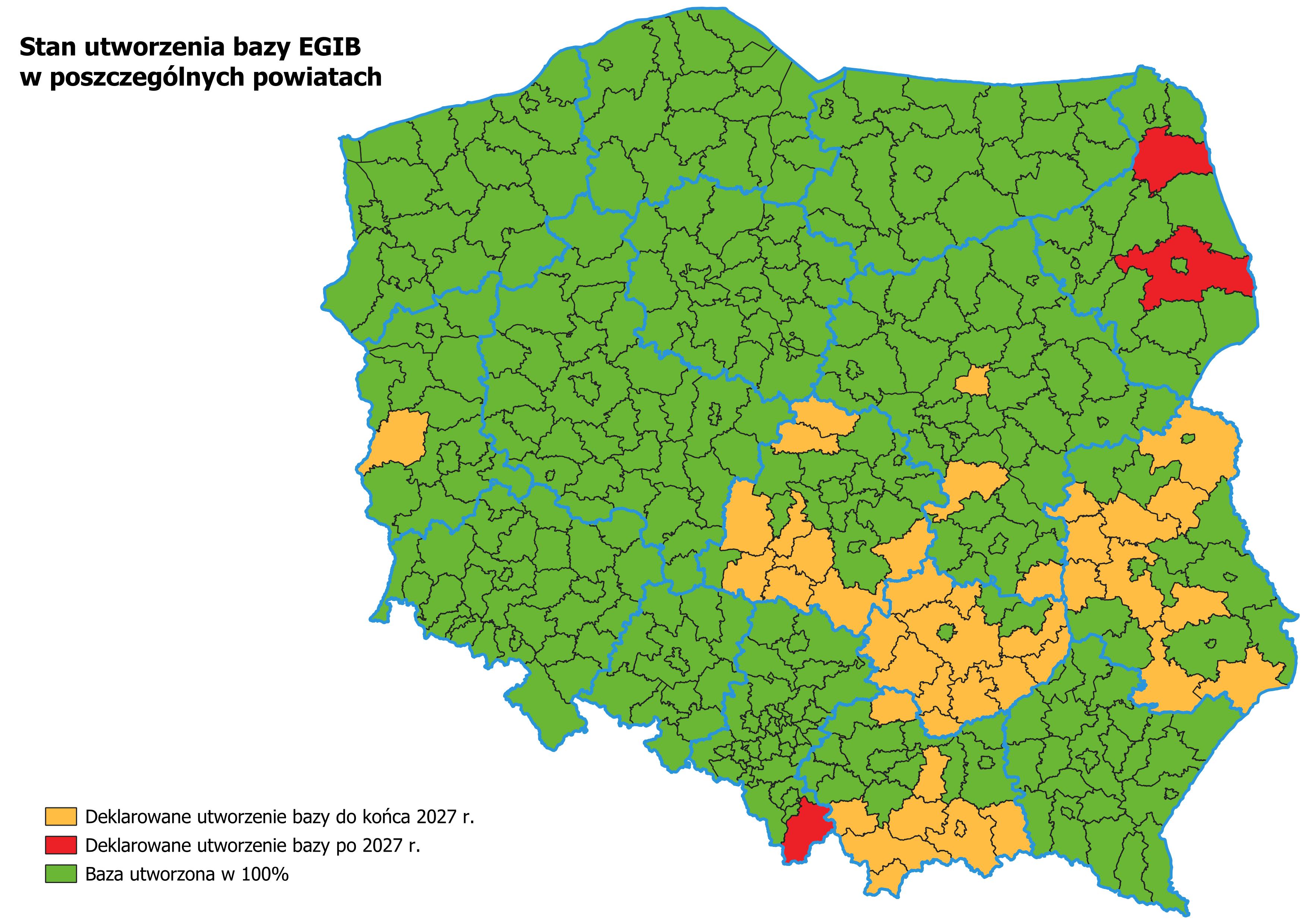 Zgodnie z art. 53b ust. 2 ustawy z dnia 17 maja 1989 r. Prawo geodezyjne i kartograficzne (Pgik) z dniem 31 grudnia 2027 r., upływa termin na utworzenie baz danych, o których mowa w art. 4 ust. 1a pkt 2, 3, 10 i 12 ustawy. W związku z powyższym przyjmując jako zadanie priorytetowe utworzenia wyżej wymienionych baz danych na terenie całego kraju, Główny Geodeta Kraju prowadzi kwartalny, monitoring ich utworzenia. Zgodnie z danymi pozyskanymi za III kwartał 2025 r., pełne utworzenie baz danych wskazuje 281 powiatów. Należy wskazać, że liczba powiatów, które finalizują prace nad utworzeniem poszczególnych baz danych systematycznie wzrasta, co jest wynikiem skutecznych działań podejmowanych zarówno przez Starostów jak i Głównego Geodetę Kraju we współpracy z Wojewódzkimi Inspektorami Nadzoru Geodezyjnego i Kartograficznego.