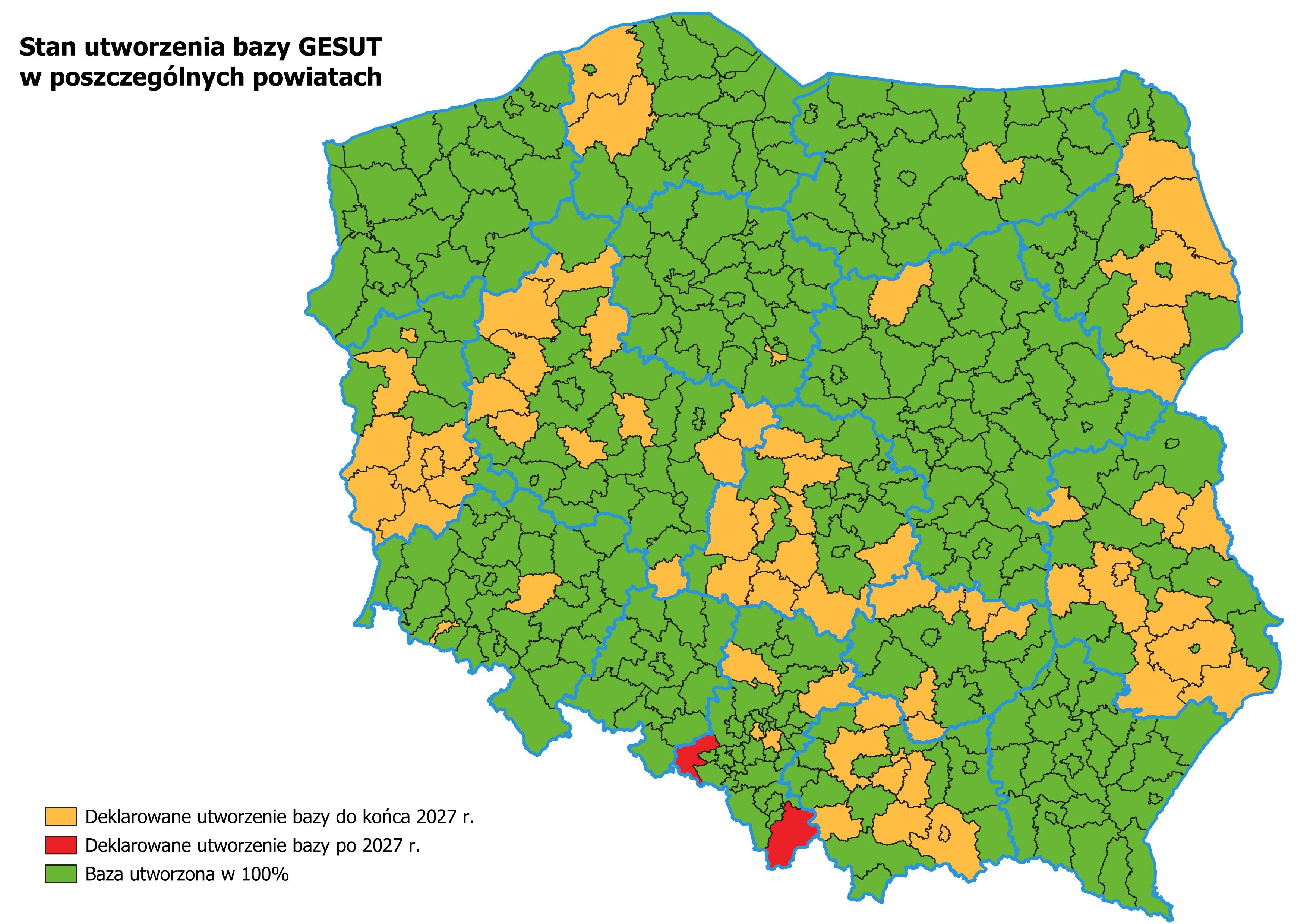 - Baza danych GESUT została założona w 308 powiatach, w tym dla części powiatów jest to baza inicjalna wymagająca pozyskania opinii, o której mowa w art. 28e ust. 1 pkt 1 ustawy Pgik.