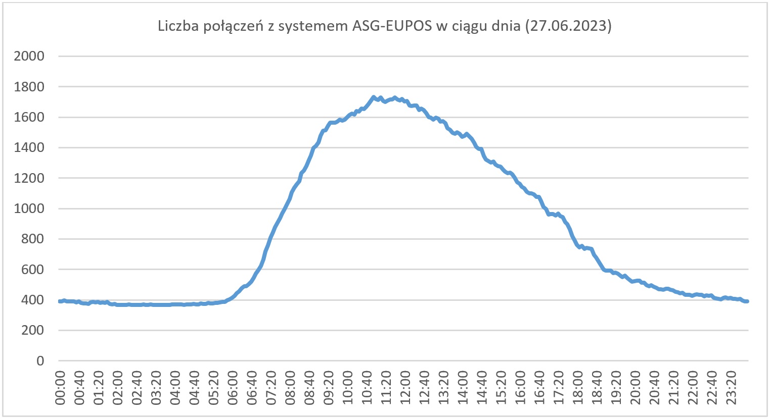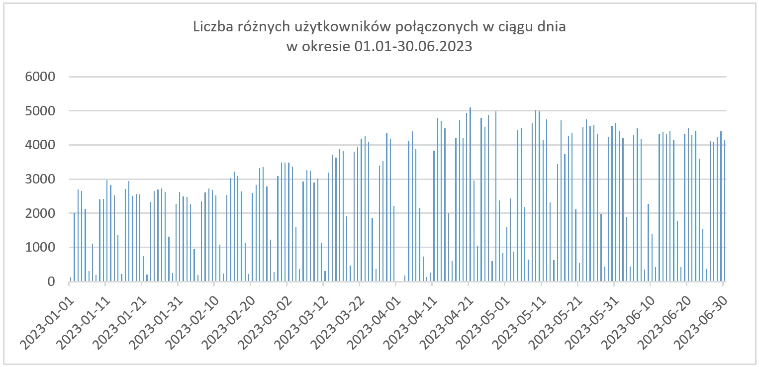 Największa dzienna liczba równoczesnych połączeń w czerwcu nieco spadła w stosunku do wiosennego maksimum i waha się w granicach 1700- 1800 połączeń w godzinach 11-12. Najwyższa dotąd odnotowana liczba użytkowników równocześnie połączonych z systemem wyniosła 2394 i miała miejsce w dniu 28.04.2023.