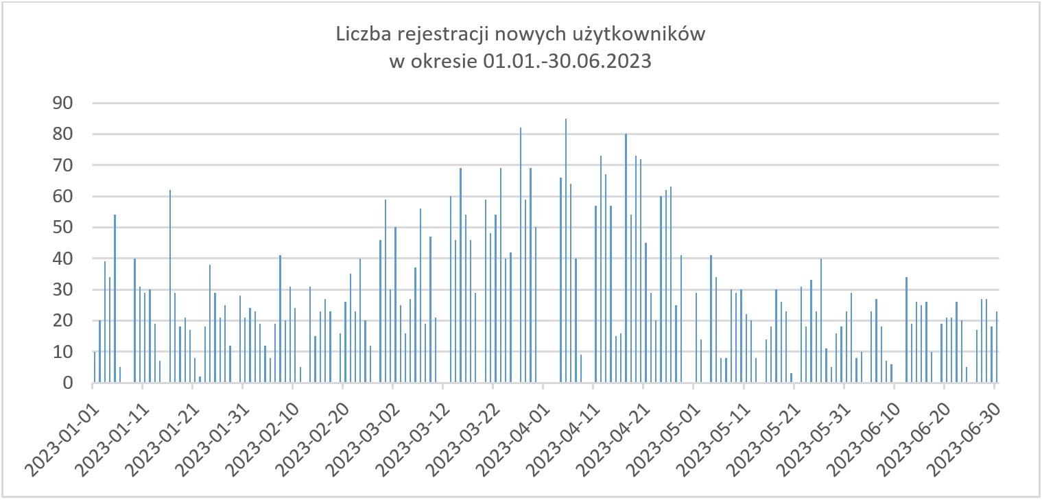 Wykres przedstawia dzienną liczbę rejestracji w okresie 01.01.2023-30.06.2023