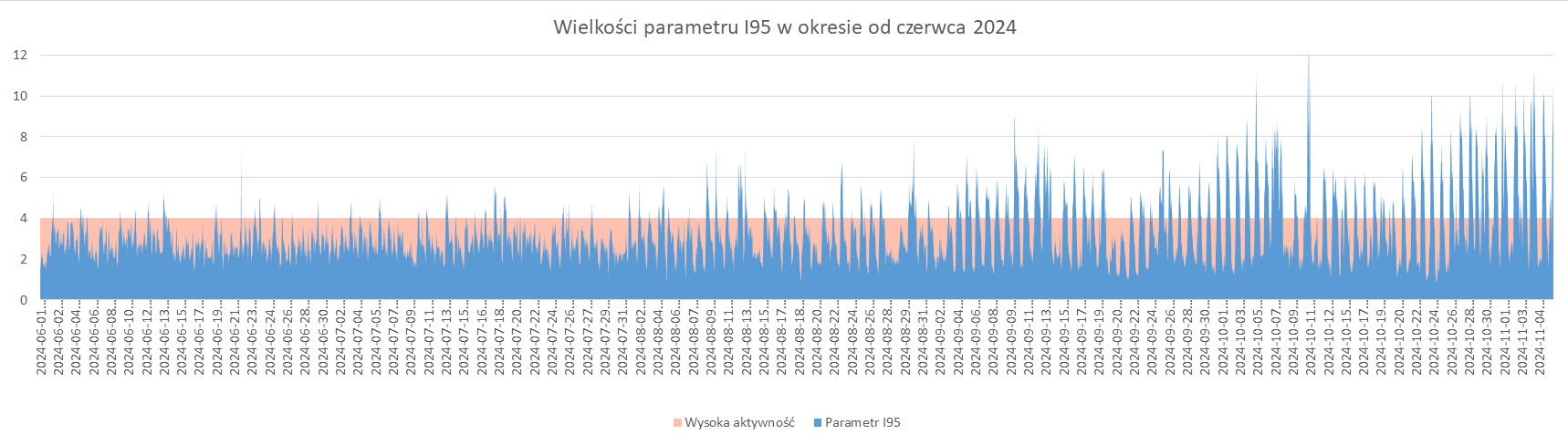 Na koniec przypominamy o zwiększonej aktywności Słońca, która ma wpływ na wykonywanie pomiarów GNSS. W październiku prawie codziennie występowały przekroczenia wartości 4 dla parametru I95, co może powodować duże utrudnienia podczas wykonywania pomiarów GNSS. Nasilenie niekorzystnych warunków nastąpiło pod koniec miesiąca i utrzymuje się w dalszym ciągu.