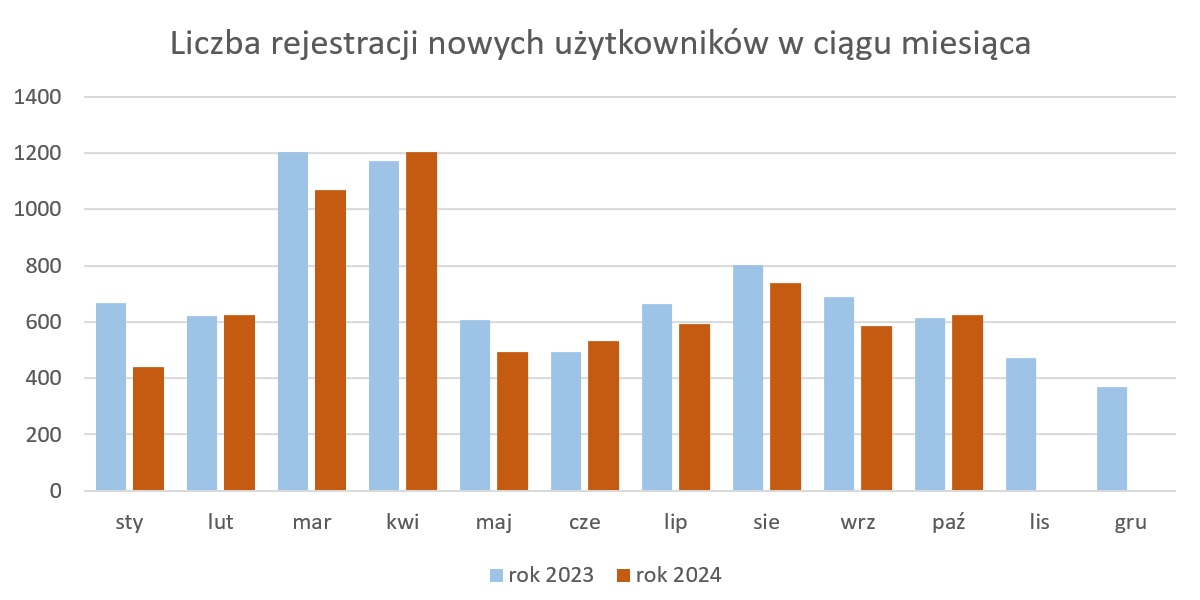Liczba rejestracji nowych użytkowników w październiku kształtowała się na podobnym poziomie co w 2023 roku i wyniosła 625 nowych użytkowników. Liczba ta nie obejmuje kont dodatkowych tworzonych do kolejnych odbiorników lub maszyn wykorzystywanych w jednym przedsiębiorstwie. We wrześniu administratorzy systemu ASG-EUPOS utworzyli około 200 takich kont.