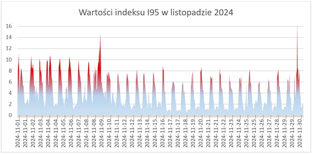 Warto zwrócić uwagę na wzmożoną aktywność Słońca oraz jej wpływ na wykonywanie pomiarów satelitarnych w okresie zimowym. We wszystkie dni listopada występowały godziny, w których wartość indeksu I95 obrazującego stan jonosfery przekraczała wartość 4, co mogło powodować problemy z wykonywaniem pomiarów satelitarnych lub powodować błędne wyznaczenie współrzędnych. Potwierdzają to również wykresy błędu jonosferycznego IRIM, którego wartości przekraczające 3 cm powodują znaczne problemy podczas inicjalizacji odbiorników GNSS. Zalecamy szczególną ostrożność w trakcie wykonywania geodezyjnych pomiarów GNSS i śledzenie wykresów parametru I95 oraz IRIM/GRIM dostępnych na stronie http://system.asgeupos.pl.