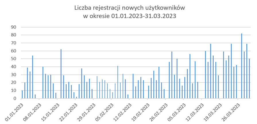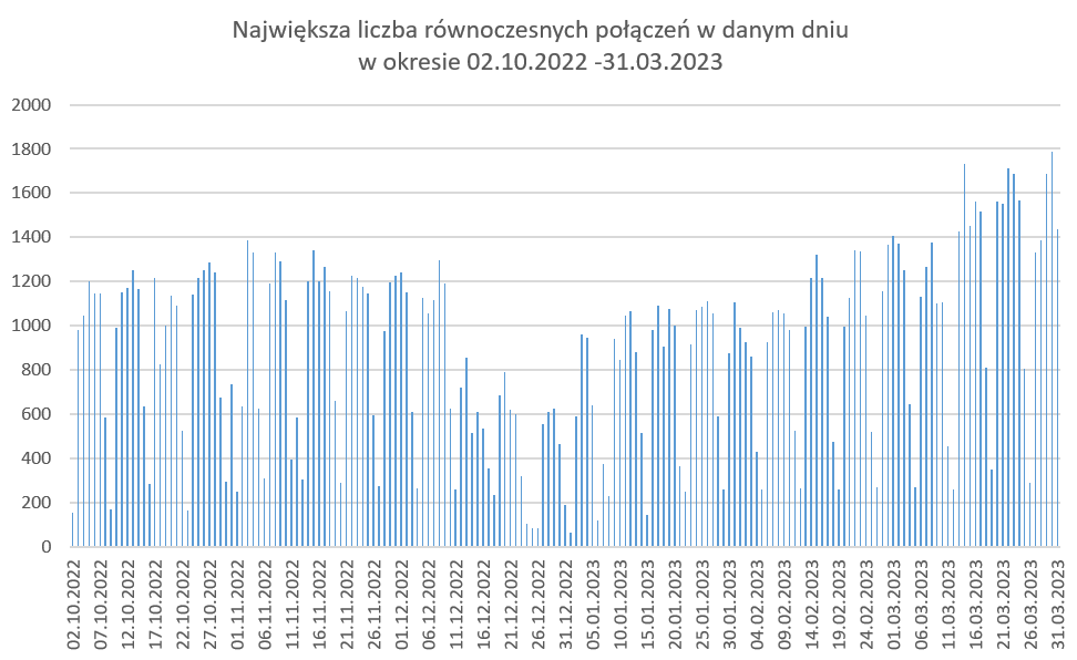Maksymalna liczba równoczesnych połączeń w marcu wzrosła w stosunku do miesięcy zimowych i średnio przekracza obecnie 1600 połączeń w godzinach 11-12. Najwyższa dotąd odnotowana liczba użytkowników równocześnie połączonych z systemem wyniosła 1785 i miała miejsce w dniu 30.03.2023.