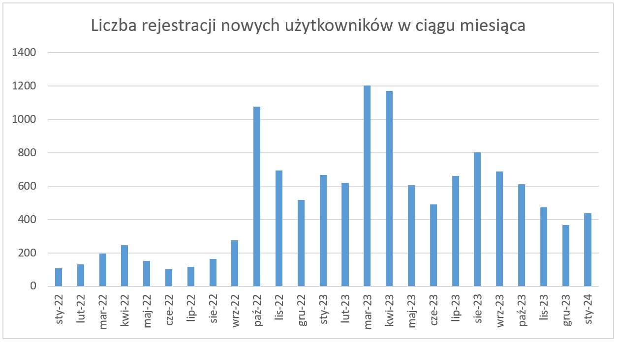 W liczbie rejestracji nowych użytkowników również odnotowany został nieznaczny spadek i w styczniu zarejestrowało się 439 użytkowników. Jest to wartość wyższa niż w grudniu ubiegłego roku, ale stosunkowo niska w odniesieniu do pozostałych miesięcy 2023 roku.