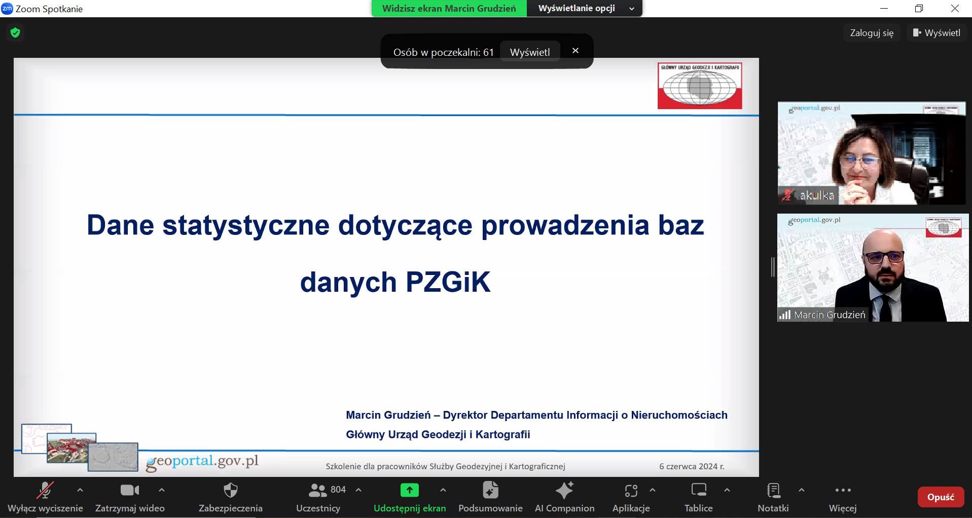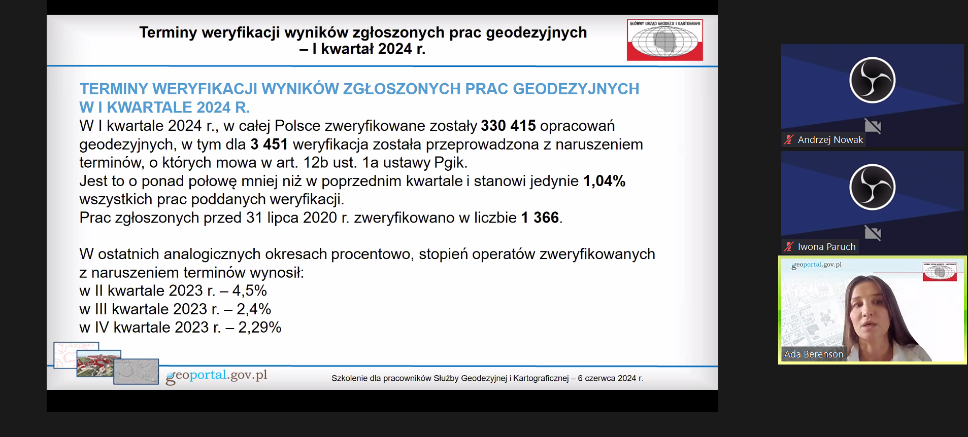Z inicjatywy Głównego Geodety Kraju Alicji Kulki 6 czerwca 2024 r. odbyło się szkolenie dla Służby Geodezyjnej i Kartograficznej. W spotkaniu, które odbyło się online na platformie ZOOM wzięło udział blisko 1000 pracowników wojewódzkiej, miejskiej i powiatowej SGiK. Podczas szkolenia omówiono bieżące działania służby geodezyjnej i kartograficznej, a także udzielono odpowiedzi na wątpliwości interpretacyjne dotyczące stosowania przepisów prawa w dziedzinie geodezji i kartografii.