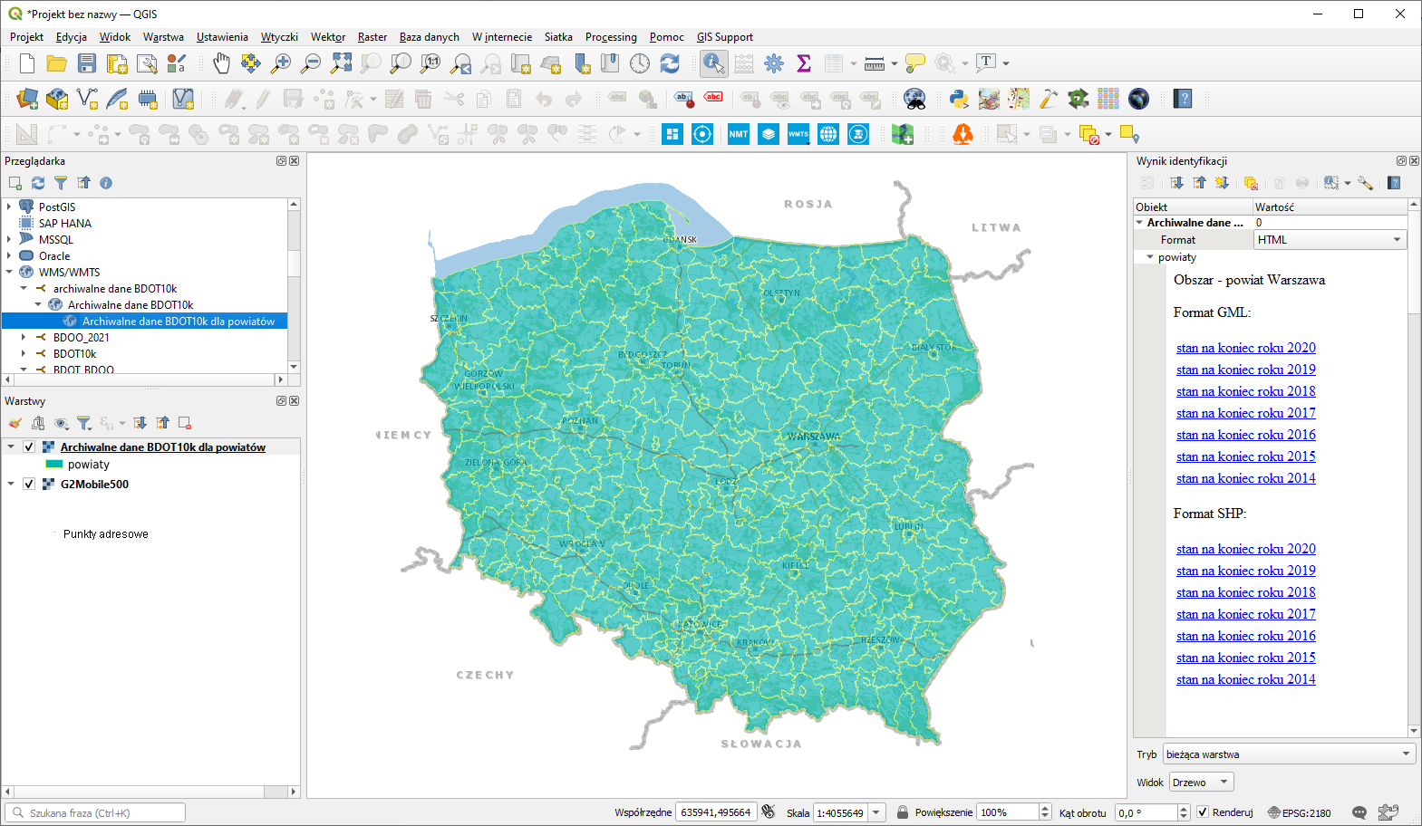 Przygotowaliśmy i udostępniliśmy do Państwa dyspozycji nową usługę sieciową WMS umożliwiającą pobranie archiwalnych danych BDOT10k w formatach GML oraz SHP dla każdego powiatu.