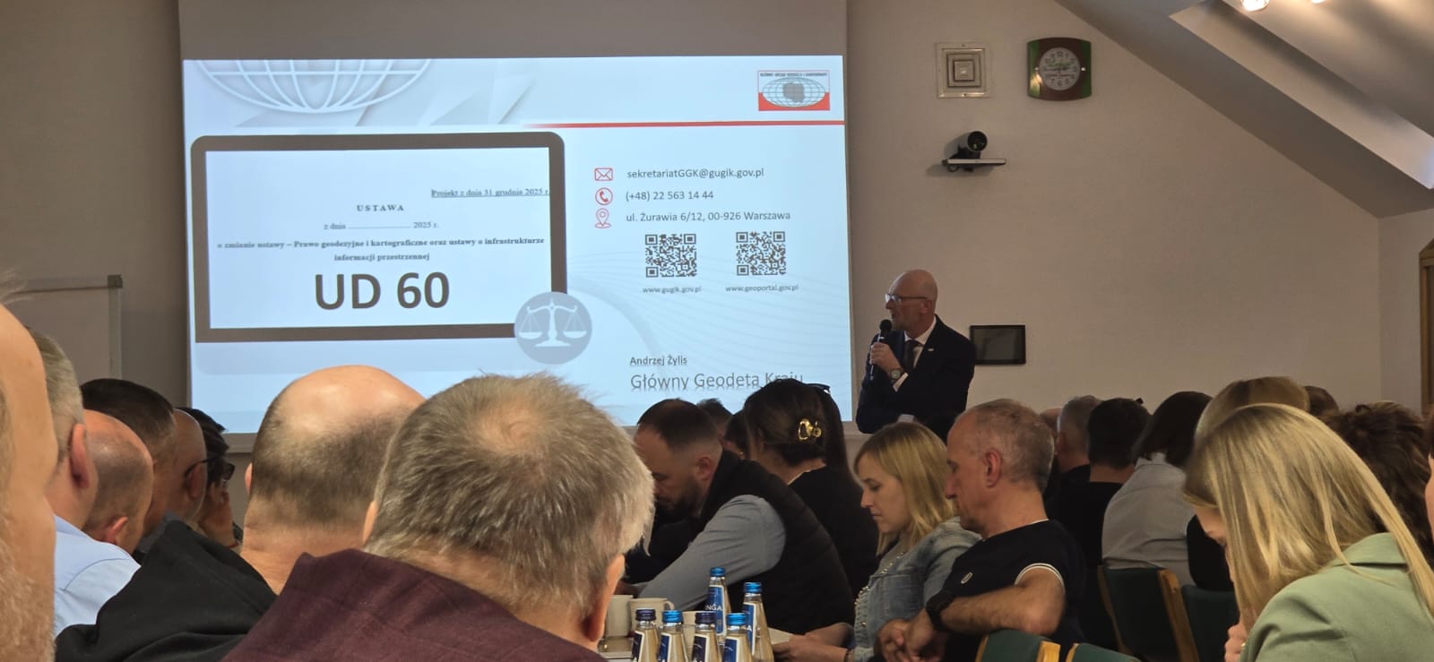 Główny Geodeta Kraju Andrzej Żyli oraz Zastępca Dyrektora Departamentu Informacji o Nieruchomościach GUGiK Szymon Szczerba 29-30 kwietnia 2026 r. wzięli udział w XLVII Warsztatach „INFO-OŚRODEK” w Ustroniu.