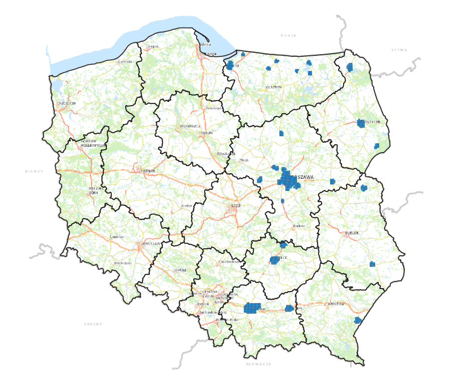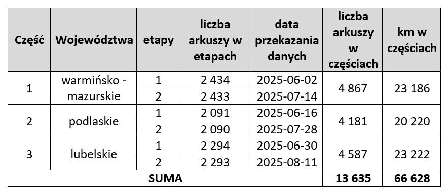 - Opracowanie wysokorozdzielczych danych fotogrametrycznych dla miast z województwa warmińsko-mazurskiego, podlaskiego, lubelskiego, mazowieckiego, świętokrzyskiego, podkarpackiego, małopolskiego, w szczególności: