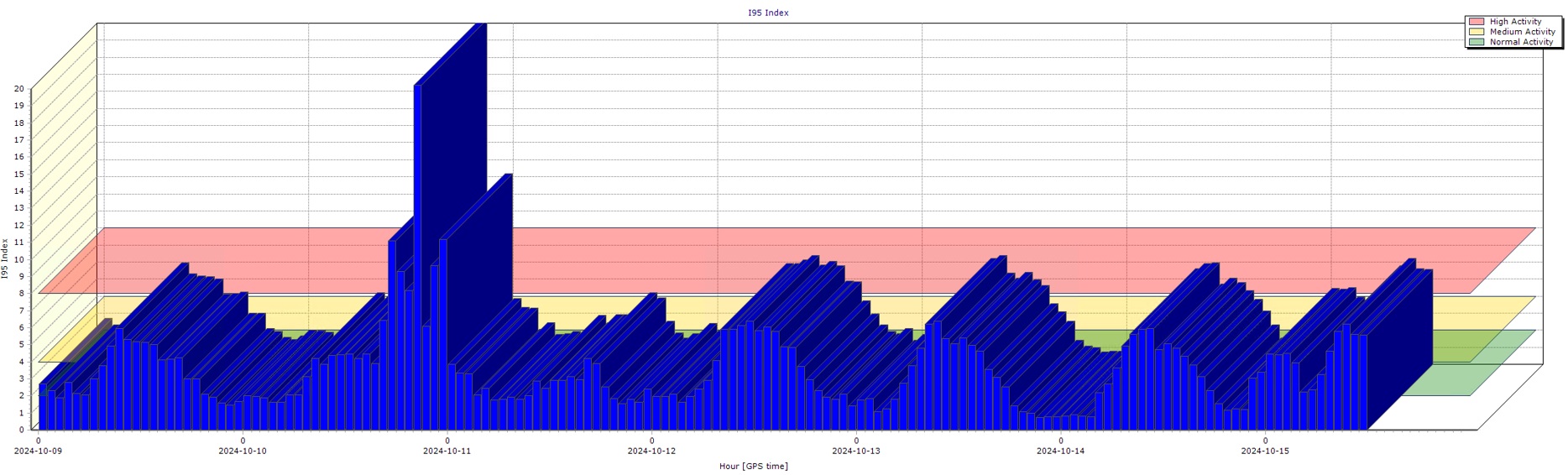 Trudno przewidzieć jak duże zakłócenia w jonosferze będą występować w kolejnych tygodniach, ale zalecamy szczególną ostrożność w trakcie wykonywania geodezyjnych pomiarów GNSS oraz śledzenie wykresów parametru I95 oraz IRIM/GRIM dostępnych na stronie http://system.asgeupos.pl. Wartości współczynnika I95 powyżej wartości 4 mogą powodować duże utrudnienia w pomiarach GNSS.