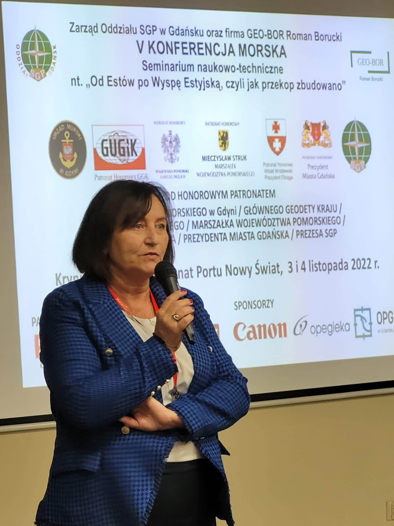 Wystąpieniem Alicji Kulki, p.o. Główny Geodeta Kraju rozpoczęła się V Konferencja Morska, seminarium naukowo – techniczne „Od Estów po Wyspę Estyjską, czyli jak PRZEKOP zbudowano”. Podczas konferencji omówiono rolę geodety w realizacji tej olbrzymiej inwestycji .Przybliżono inżynieryjne pomiary wysokiej precyzji zastosowane podczas obsługi budowy infrastruktury tej historycznej inwestycji. W prezentacjach przedstawiono również historyczne aspekty Mierzei Wiślanej, budowy przekopu tej Mierzei Wiślanej czyli realizacji kanału żeglugowego budowy drogi wodnej łączącej Zalew Wiślany z Zatoką Gdańską. Uczestnicy konferencji zwiedzili budowę Portu Nowy Świat ,a także punkty graniczne „Granicy Wersalskiej” , które zachowały się do dnia dzisiejszego w nienaruszonym stanie.