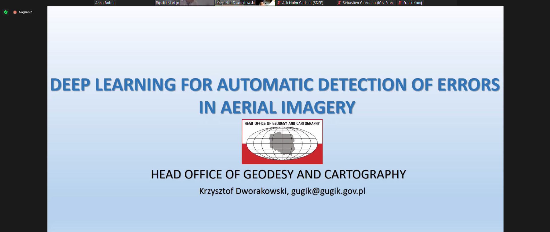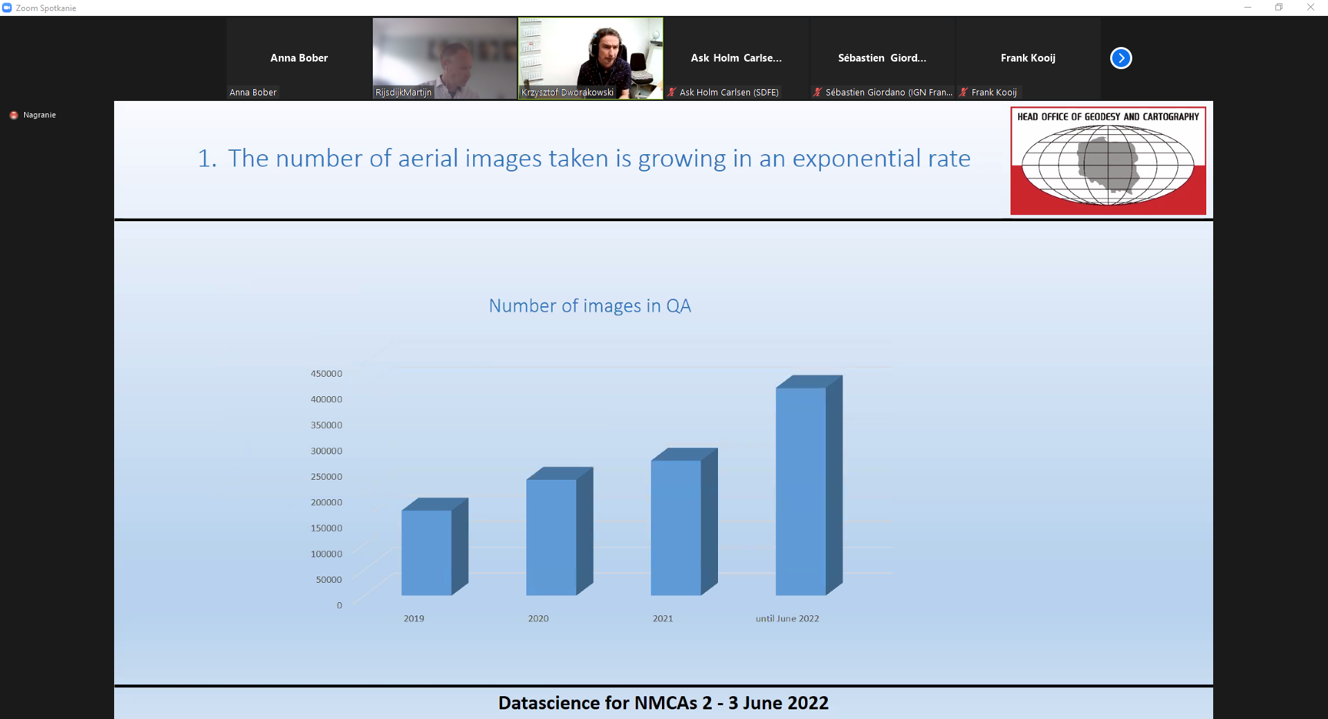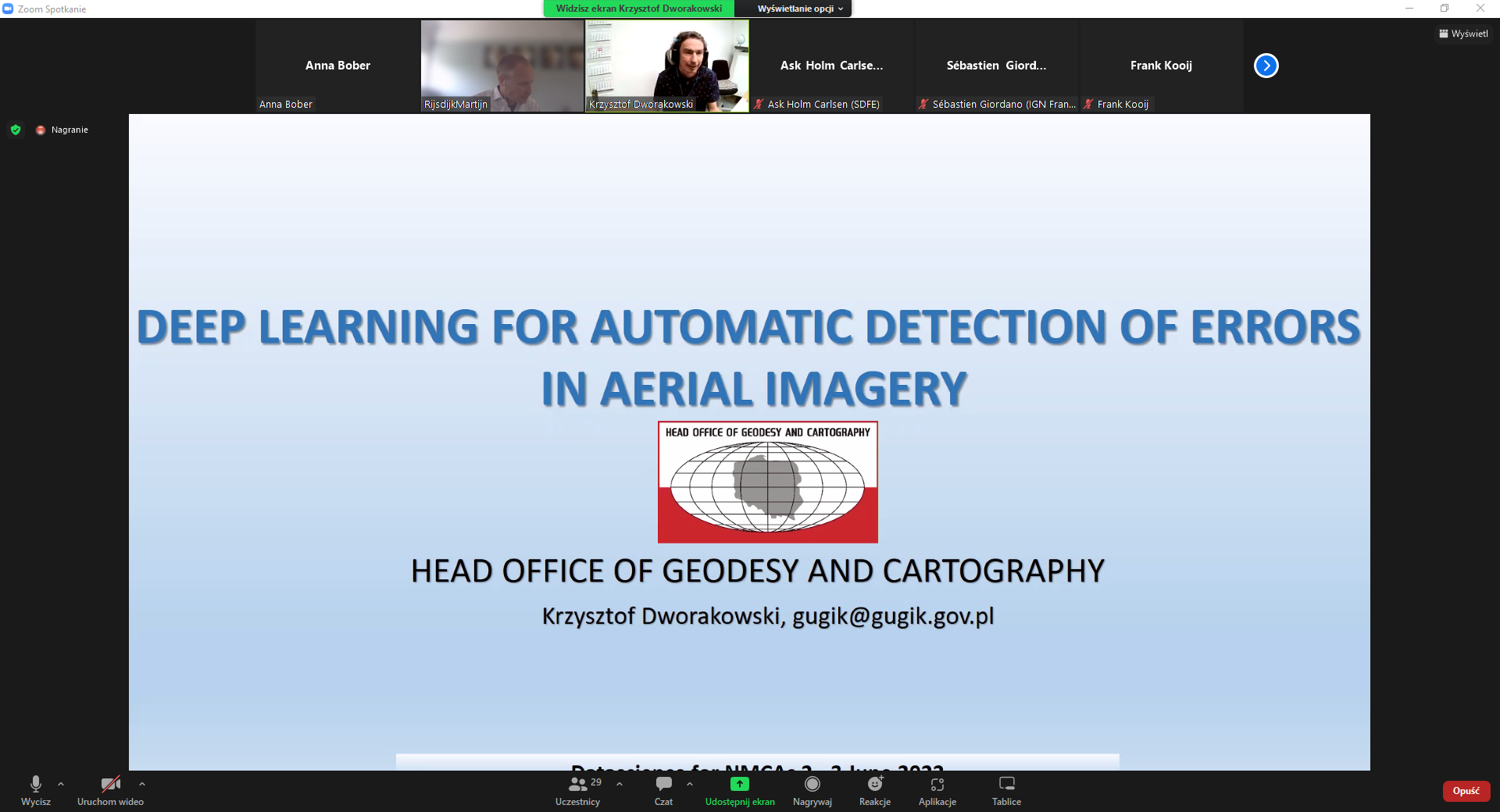W dniach 2-3 czerwca 2022 r. w formie videokonferencji odbywają się warsztaty EuroSDR pod nazwą „Data science in NMCA’s” współorganizowane przez Departament Geodezji, Kartografii i Systemów Informacji Geograficznej GUGiK. Pierwszy dzień warsztatów koncentrował się na wykorzystaniu różnych metod AI w przetwarzaniu i analizach danych geoprzestrzennych, w szczególności danych obrazowych oraz LIDAR. O wyzwaniach i doświadczeniach z wdrażania projektów data science w Urzędach Geodezyjnych i Kartograficznych opowiadali m.in. przedstawiciele IGN z Francji, Uniwersytetu w Kopenhadze, National Land Survey z Finlandii oraz GUGiK. Krzysztof Dworakowski z Departamentu Geodezji, Kartografii i Systemów Informacji Geograficznej GUGiK omówił metodykę automatycznego wykrywania błędów radiometrycznych na zdjęciach lotniczych z wykorzystaniem deep learning wykorzystywaną w kontroli zdjęć lotniczych przyjmowanych do Państwowego Zasobu Geodezyjnego i Kartograficznego.