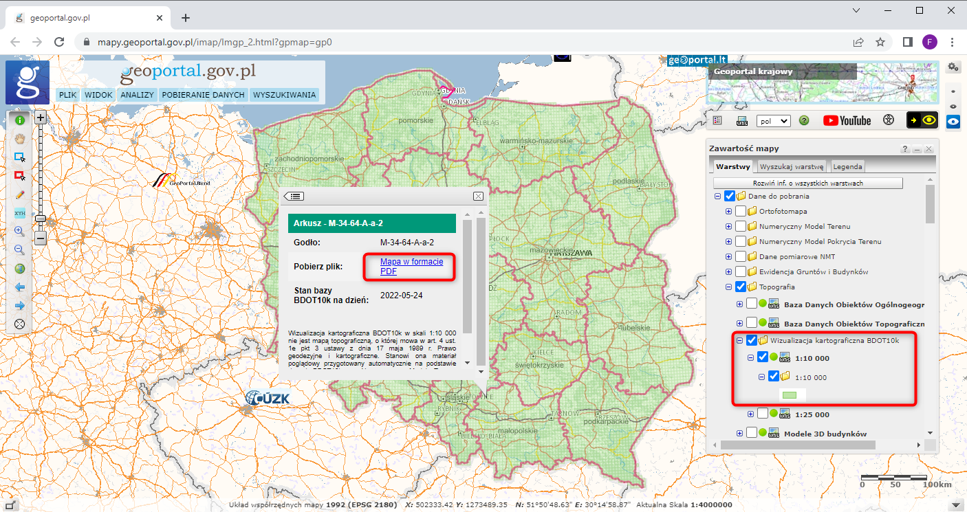 Pliki można pobrać wprost z serwisu www.geoportal.gov.pl, wybierając warstwę „Wizualizacja kartograficzna BDOT10k”w grupie warstw „Dane do pobrania -> „Topografia”. Następnie po wybraniu interesującego arkusza i kliknięciu na jego obszarze w oknie mapy pojawia się możliwość pobrania pliku PDF.