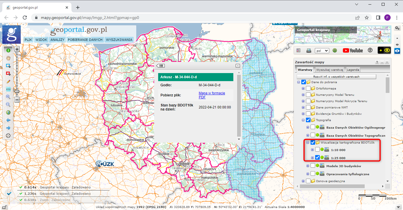 W serwisie www.geoportal.gov.pl udostępniliśmy do pobrania kolejne wizualizacje kartograficzne BDOT10k w skali 1:25 000 – dla obszaru województwa podkarpackiego. Pliki w formacie PDF są obecnie dostępne również dla obszaru województw lubelskiego i podlaskiego, ale sukcesywnie dane będą udostępniane dla kolejnych województw.