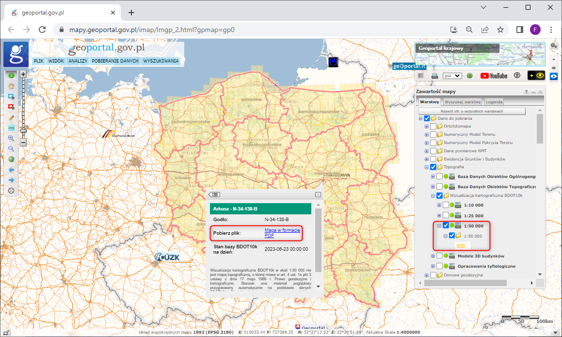 Pliki można pobrać wprost z serwisu www.geoportal.gov.pl, wybierając warstwę „Wizualizacja kartograficzna BDOT10k” - „1:50 000” w grupie warstw „Dane do pobrania” - „Topografia”. Następnie po wybraniu interesującego nas arkusza i kliknięciu na jego obszarze w oknie mapy pojawia się możliwość pobrania pliku PDF.