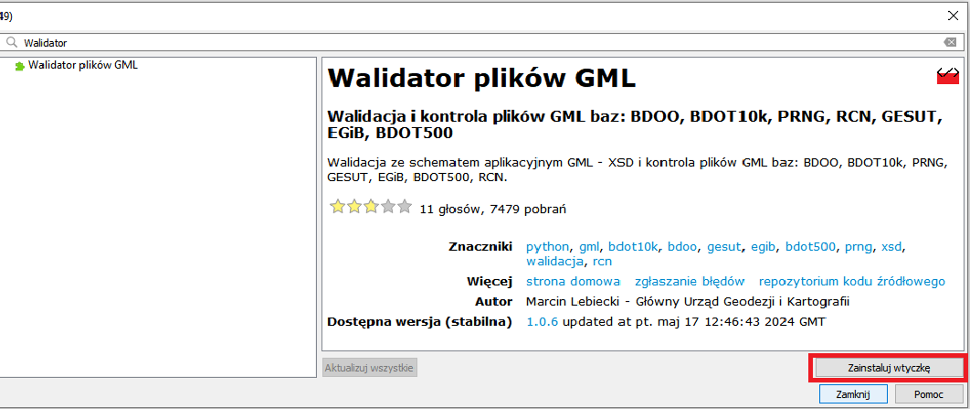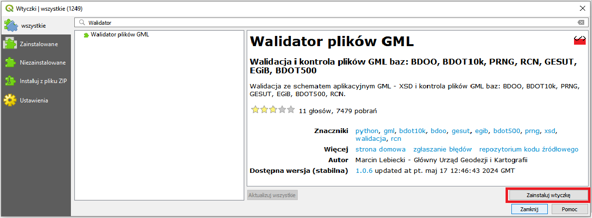 Następnie w wyszukiwarce wszystkich wtyczek wpisać „Walidator plików GML”, a następnie zaznaczyć wyszukaną wtyczkę „Walidator plików GML” i kliknąć przycisk „Zainstaluj wtyczkę”.