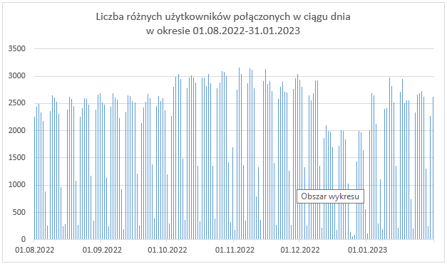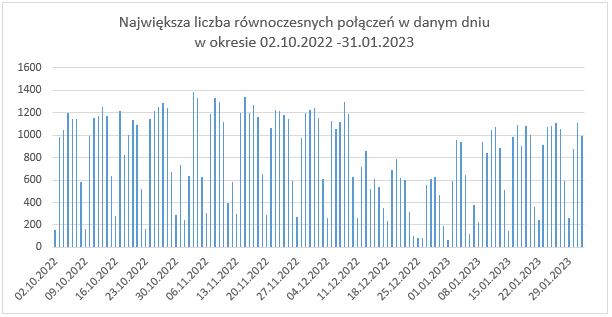 Maksymalna liczba równoczesnych połączeń w styczniu nieco spadła w stosunku do poprzednich miesięcy, ale nadal przekracza 1000 połączeń w godzinach 11-12. Wciąż najwyższa dotąd odnotowana liczba użytkowników równocześnie połączonych z systemem wyniosła 1387 i miała miejsce w dniu 03.11.2022.