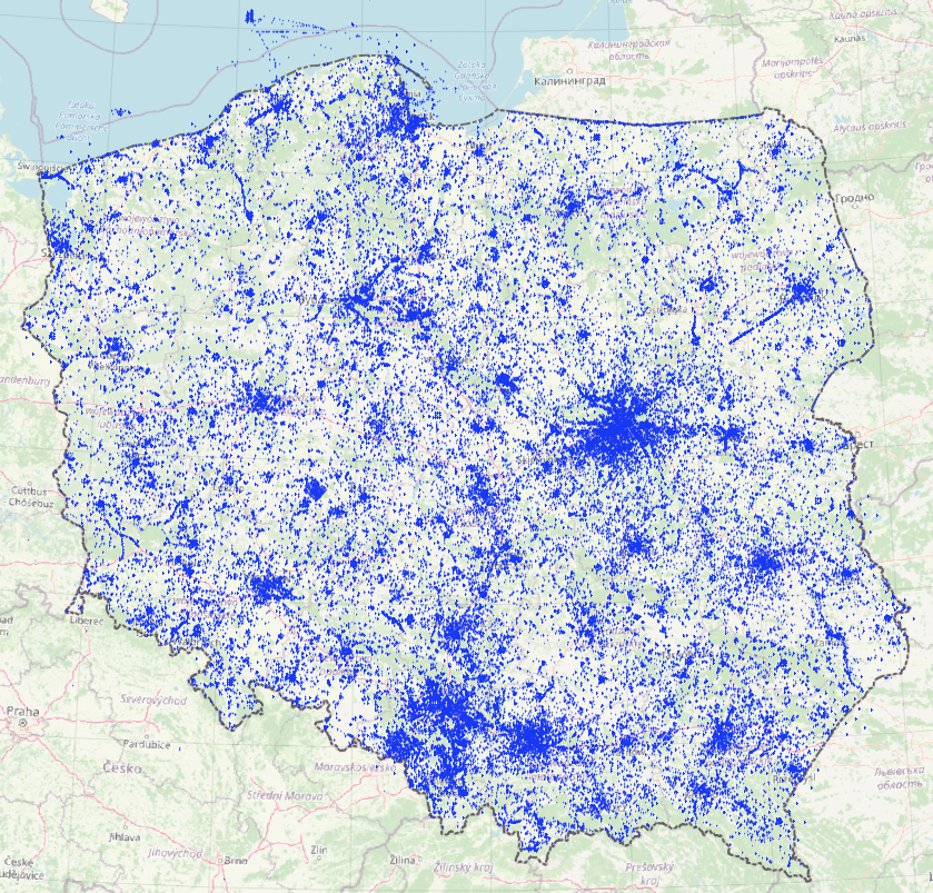 Poniższy rysunek prezentuje rozmieszczenie pozycji użytkowników łączących się z sieciowymi danymi korekcyjnymi RTN w styczniu 2023 roku: