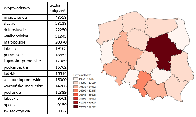 Przeanalizowaliśmy jak rozkłada się liczba połączeń w poszczególnych województwach: