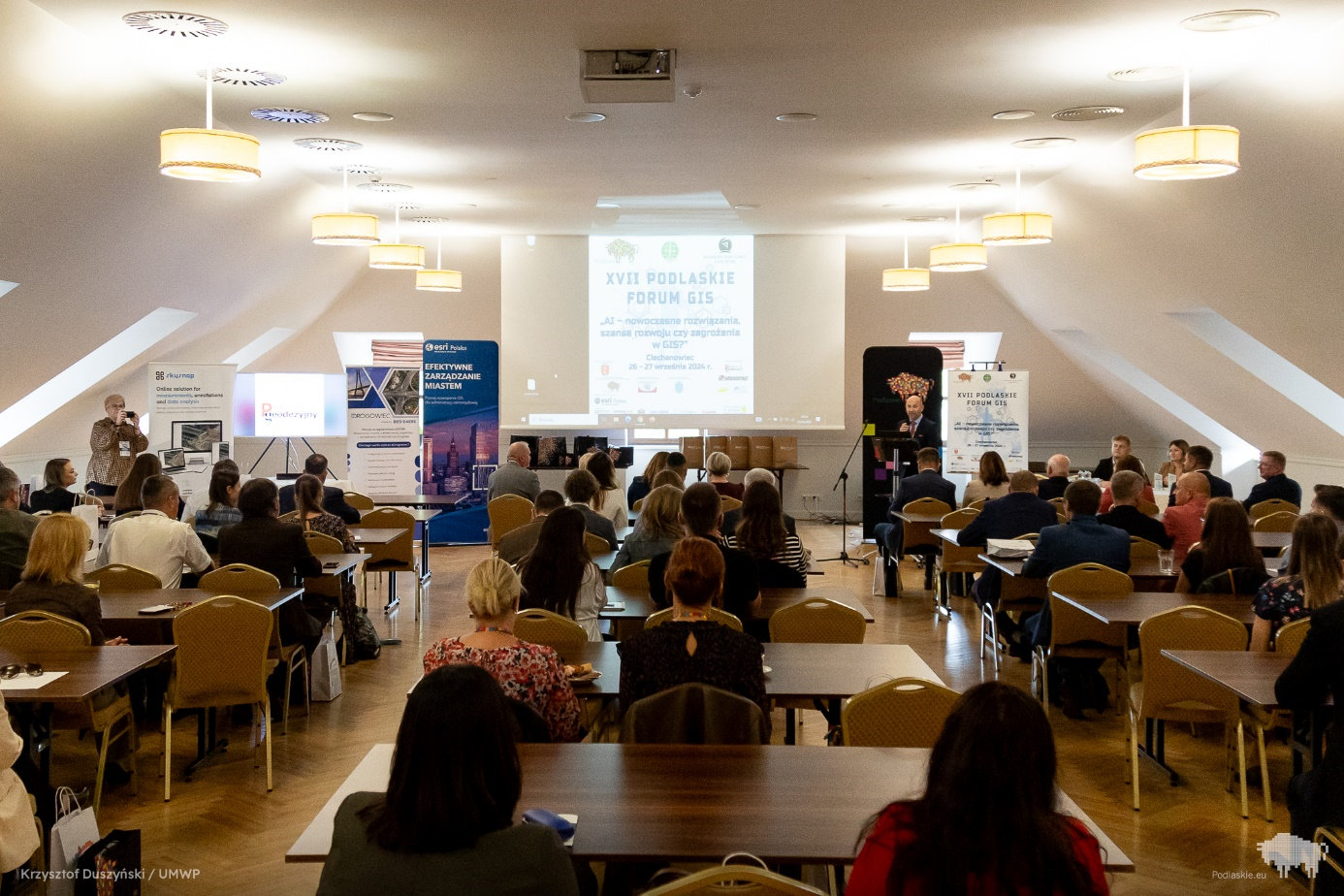 Pod honorowym patronatem Głównego Geodety Kraju Alicji Kulki, w dniach 26-27 września 2024 w Ciechanowcu odbyło się XVII Podlaskie Forum GIS pt. „AI - nowoczesne rozwiązania, szansa rozwoju czy zagrożenia w GIS?” zorganizowane przez Marszałka Województwa Podlaskiego, Stowarzyszenie Geodetów Polskich oraz Wojewódzkie Biuro Geodezji w Białymstoku. Konferencja była okazją do wymiany wiedzy, doświadczeń oraz dyskusji nad oczekiwaniami i wymaganiami stawianymi przed administracją publiczną w zakresie wykorzystania sztucznej inteligencji. W wydarzeniu wzięła udział Zastępca Głównego Geodety Kraju Anna Bober, która przedstawiła wybrane działania realizowane przez Głównego Geodetę Kraju oraz przykłady zastosowań sztucznej inteligencji w Głównym Urzędzie Geodezji i Kartografii.