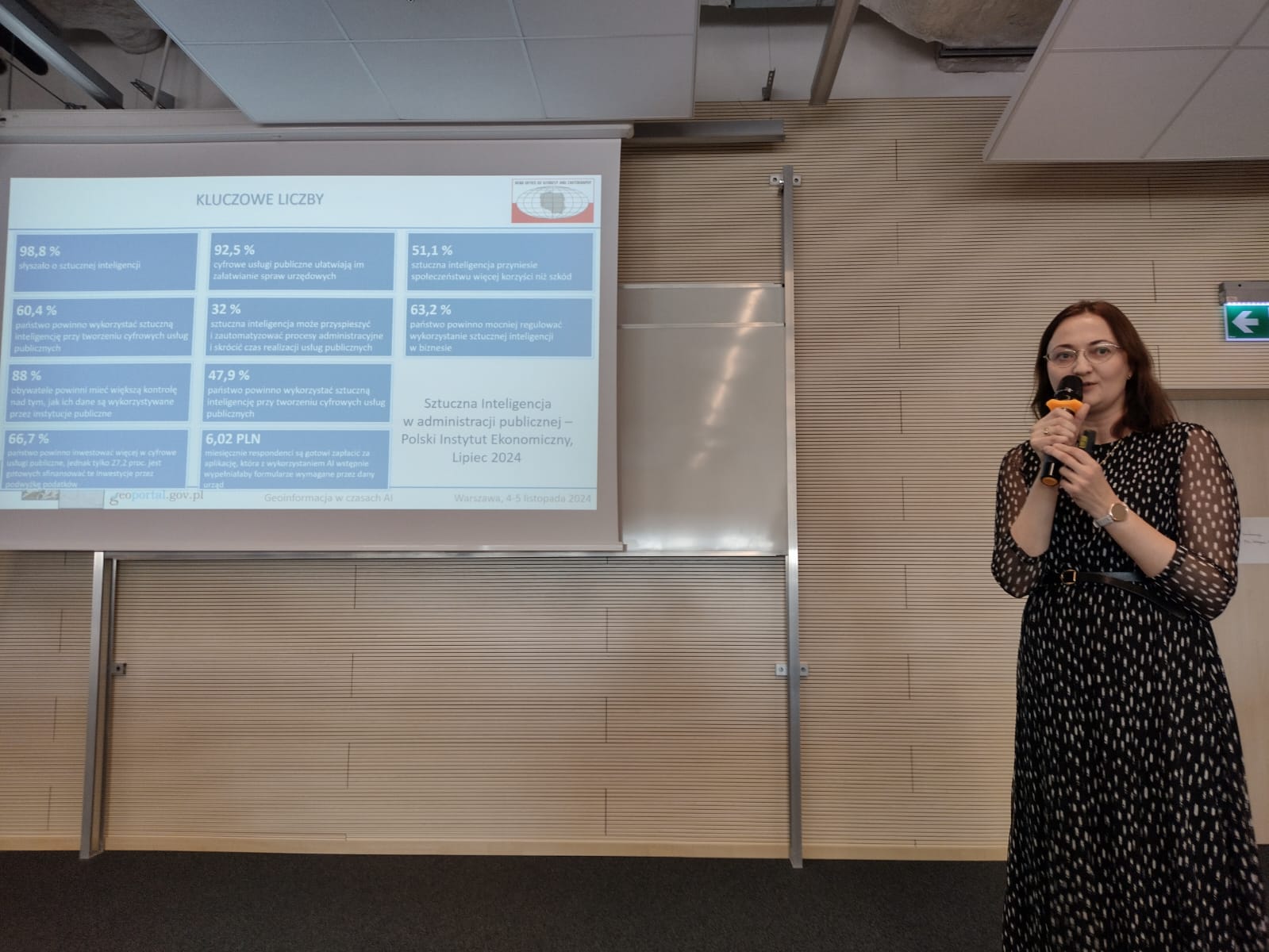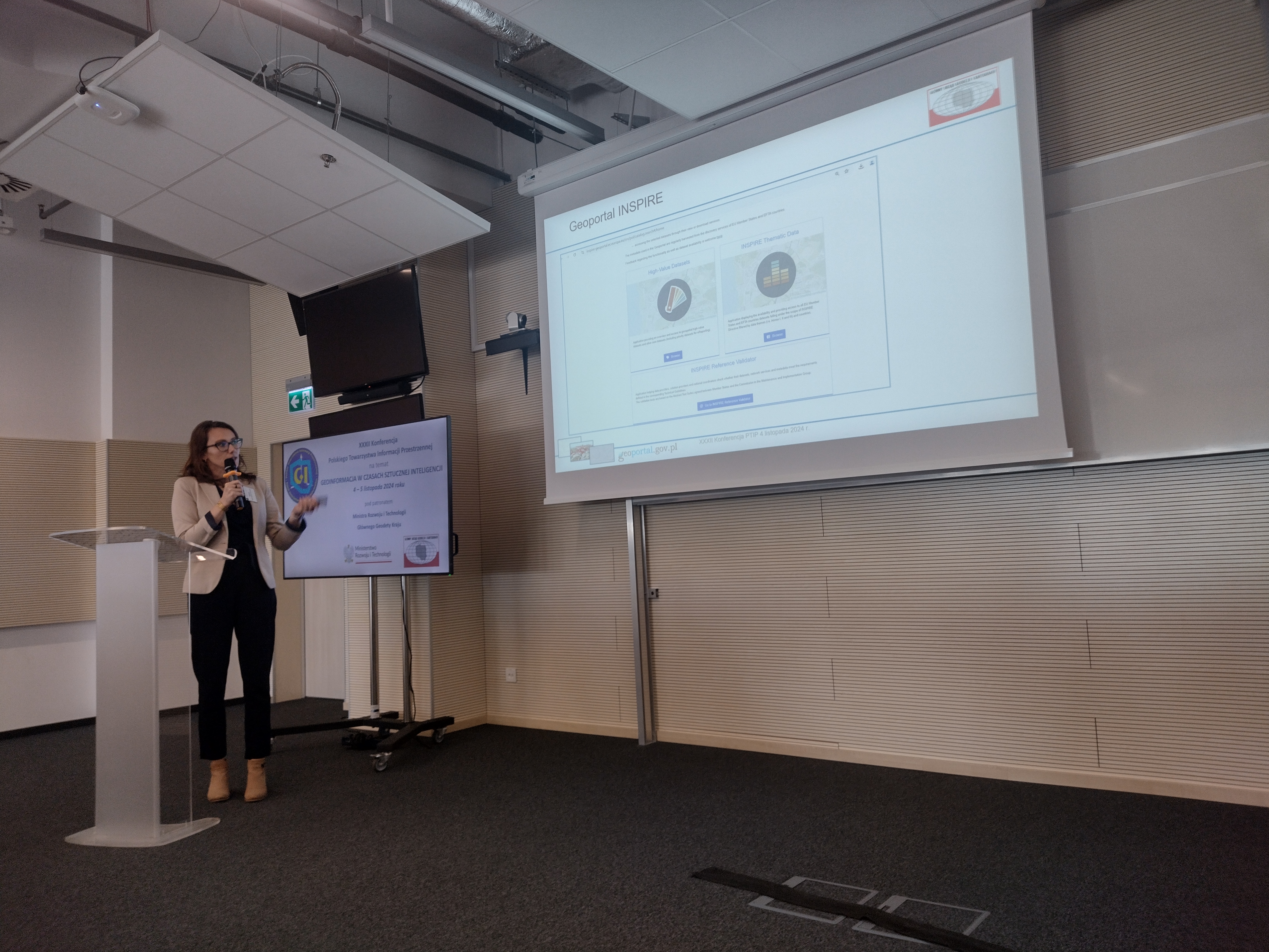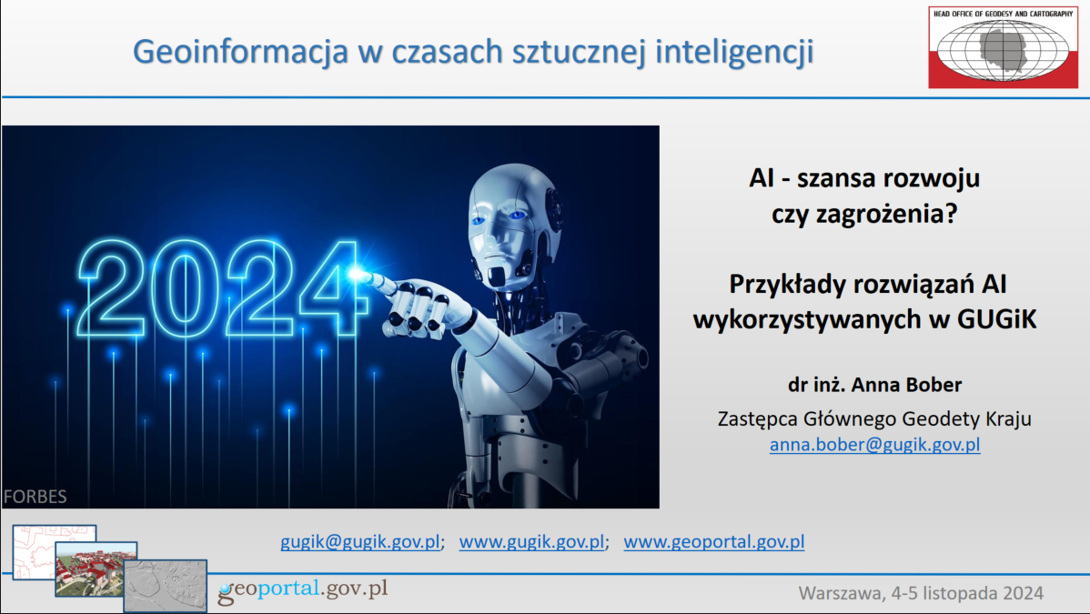 Pod patronatem Głównego Geodety Kraju Alicji Kulki w dniach 4 – 5 listopada 2024 r. odbyła się XXXII konferencja Polskiego Towarzystwa Informacji Przestrzennej na temat „Geoinformacja w czasach sztucznej inteligencji”. Tematyka konferencji obejmowała zagadnienia dotyczące zastosowań tej technologii (w tym GenAI) w rozwiązaniach związanych z informacją przestrzenną. Poza zagadnieniami związanymi ze sztuczną inteligencją obrady obejmowały tematykę dotyczącą geoinformacji w administracji publicznej, geoportali, norm ISO w obszarze danych przestrzennych jak również cyfryzacji planowania przestrzennego. Główny Urząd Geodezji i Kartografii reprezentowały Anna Bober - Zastępca Głównego Geodety Kraju oraz Ewa Surma - Dyrektor Departamentu Strategii i Współpracy Zagranicznej omawiając szanse i zagrożenia związane z wdrażaniem sztucznej inteligencji, działania realizowane przez GUGiK oraz kierunki rozwoju INSPIRE.