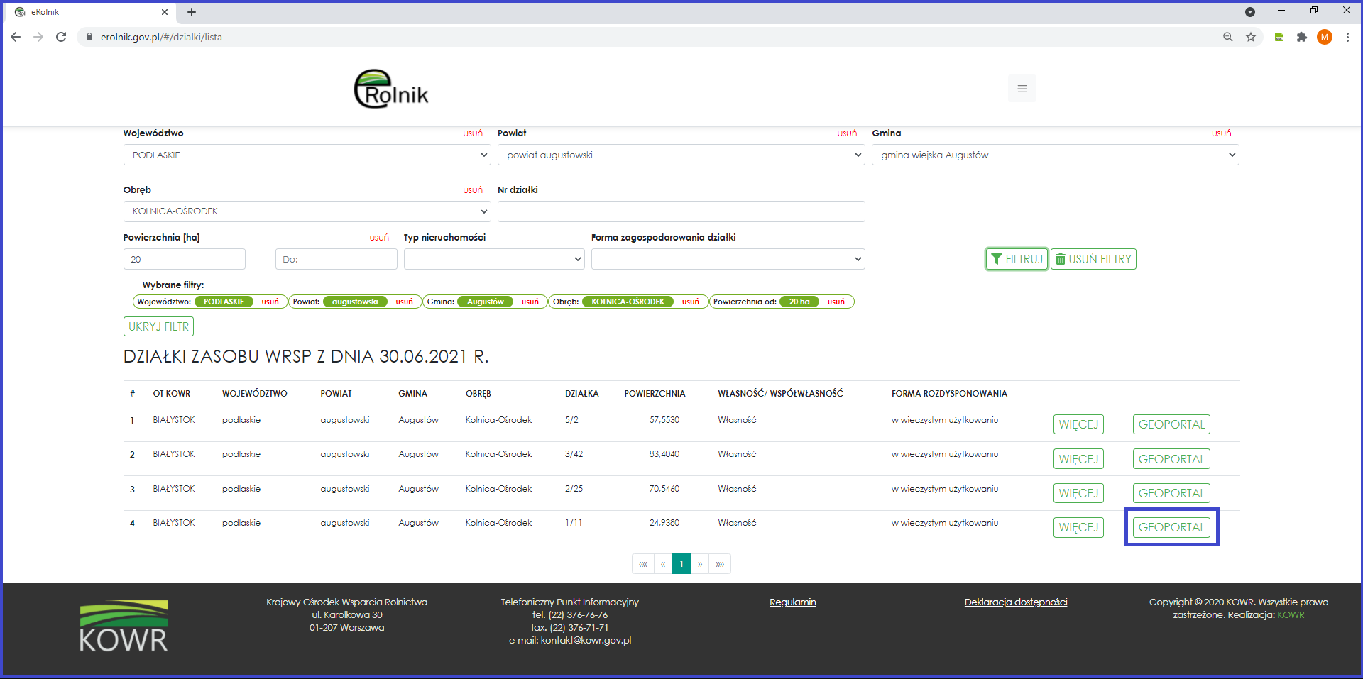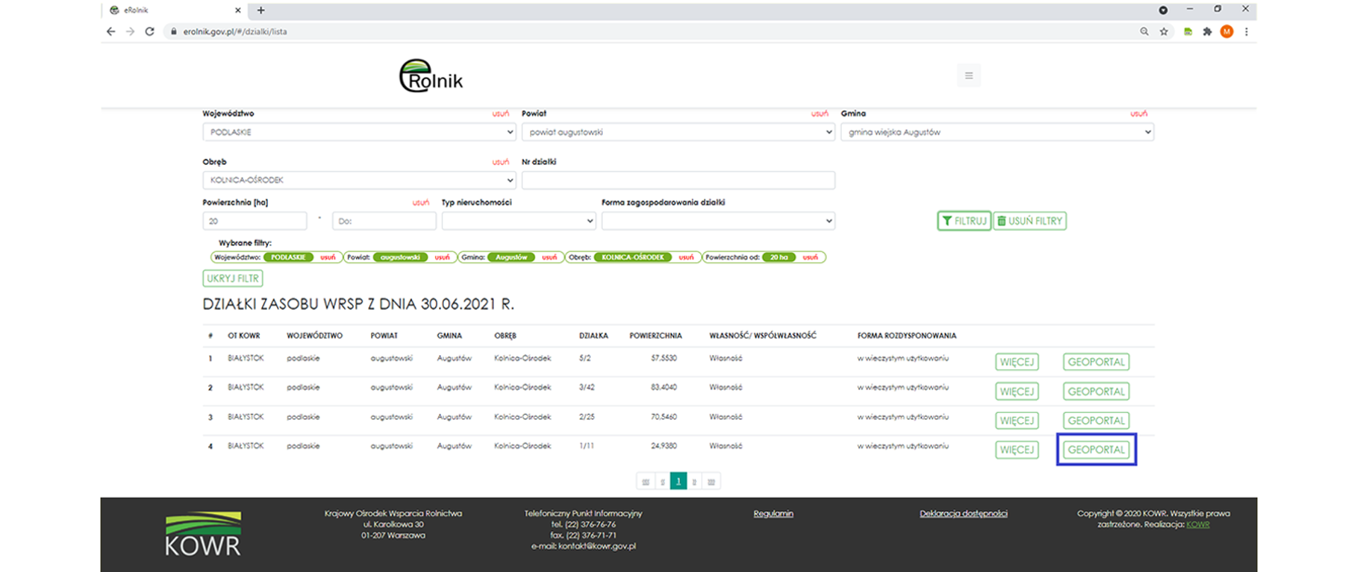 W tym celu wystarczy odszukać w wykazie wybraną działkę ewidencyjną, a następnie kliknąć przycisk „GEOPORTAL”, który przekieruje użytkownika wprost do Geoportalu.