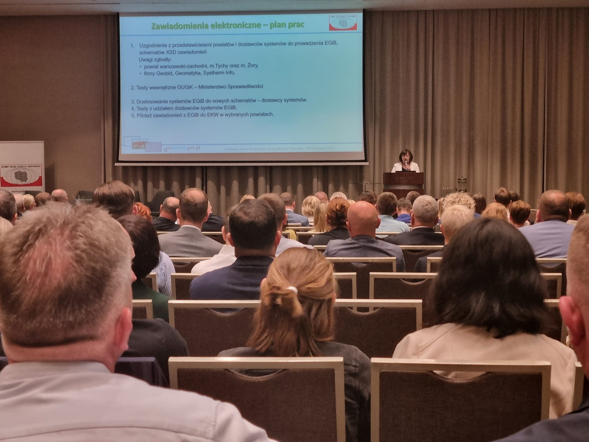 Przez dwa dni (29-30 sierpnia 2022 r.) przedstawiciele Służby Geodezyjnej i Kartograficznej rozmawiali o najbardziej nurtujących środowisko zagadnieniach. W zorganizowanym przez p.o. Głównego Geodetę Kraju Alicję Kulkę w formie hybrydowej spotkaniu uczestniczyło ponad 900 osób – stacjonarnie blisko 300 osób, a zdalnie ponad 600 Wojewódzkich Inspektorów Nadzoru Geodezyjnego i Kartograficznego, Geodetów Województw, Geodetów Powiatowych, Kierowników PODGiK i ich współpracowników.
