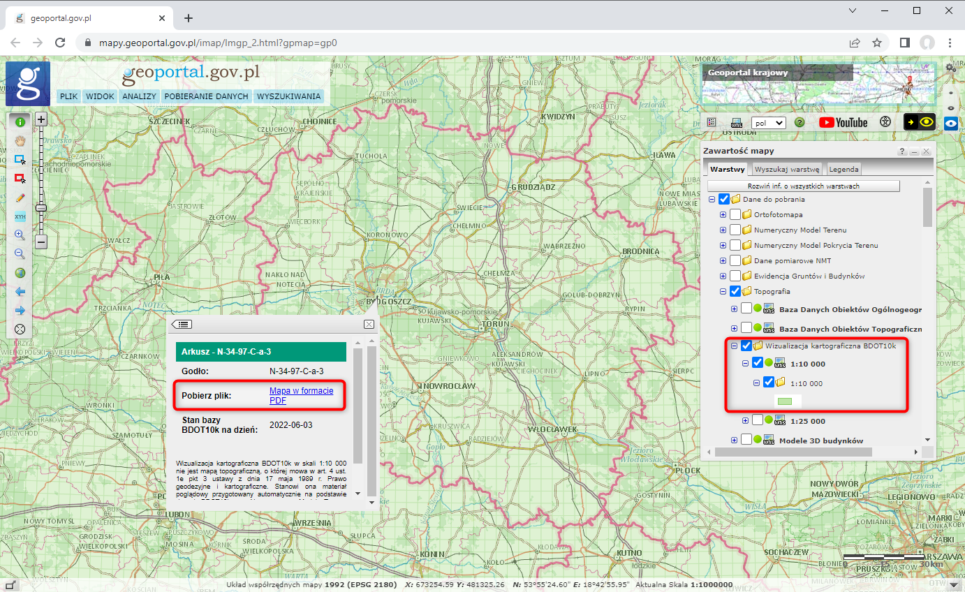 Pliki można pobrać wprost z serwisu www.geoportal.gov.pl, wybierając warstwę „Wizualizacja kartograficzna BDOT10k” - „1:10 000” w grupie warstw „Dane do pobrania” - „Topografia”. Następnie po wybraniu interesującego nas arkusza i kliknięciu na jego obszarze w oknie mapy pojawia się możliwość pobrania pliku PDF.
