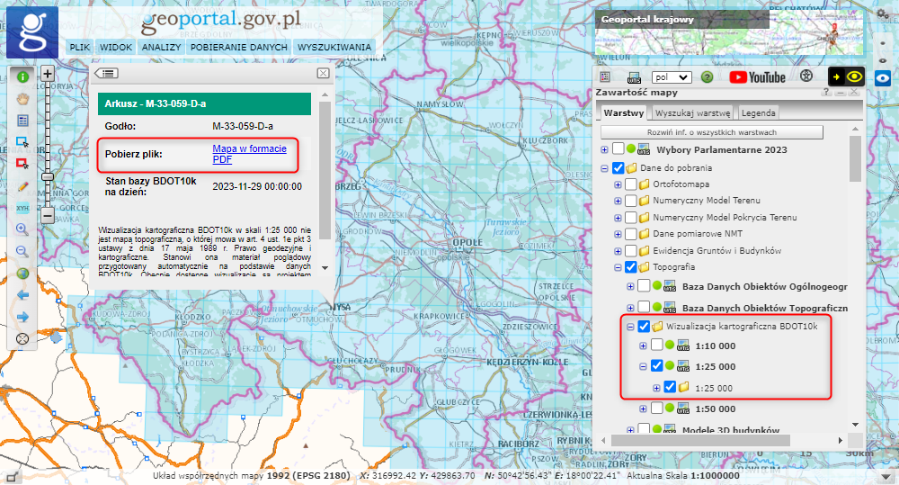 Nowo wygenerowane wizualizacje kartograficzne BDOT10k w skali 1:25 000 można pobrać wprost z serwisu www.geoportal.gov.pl, wybierając warstwę „Wizualizacja kartograficzna BDOT10k” w grupie warstw „Dane do pobrania” - „Topografia”. Następnie po wybraniu interesującego arkusza i kliknięciu na jego obszarze w oknie mapy pojawia się możliwość pobrania pliku PDF.