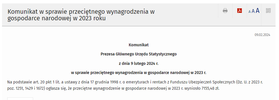 Zgodnie z Komunikatem Prezesa Głównego Urzędu Statystycznego z dnia 9 lutego 2024 r. przeciętne wynagrodzenie w gospodarce narodowej w 2023 r. wyniosło 7155,48 zł.