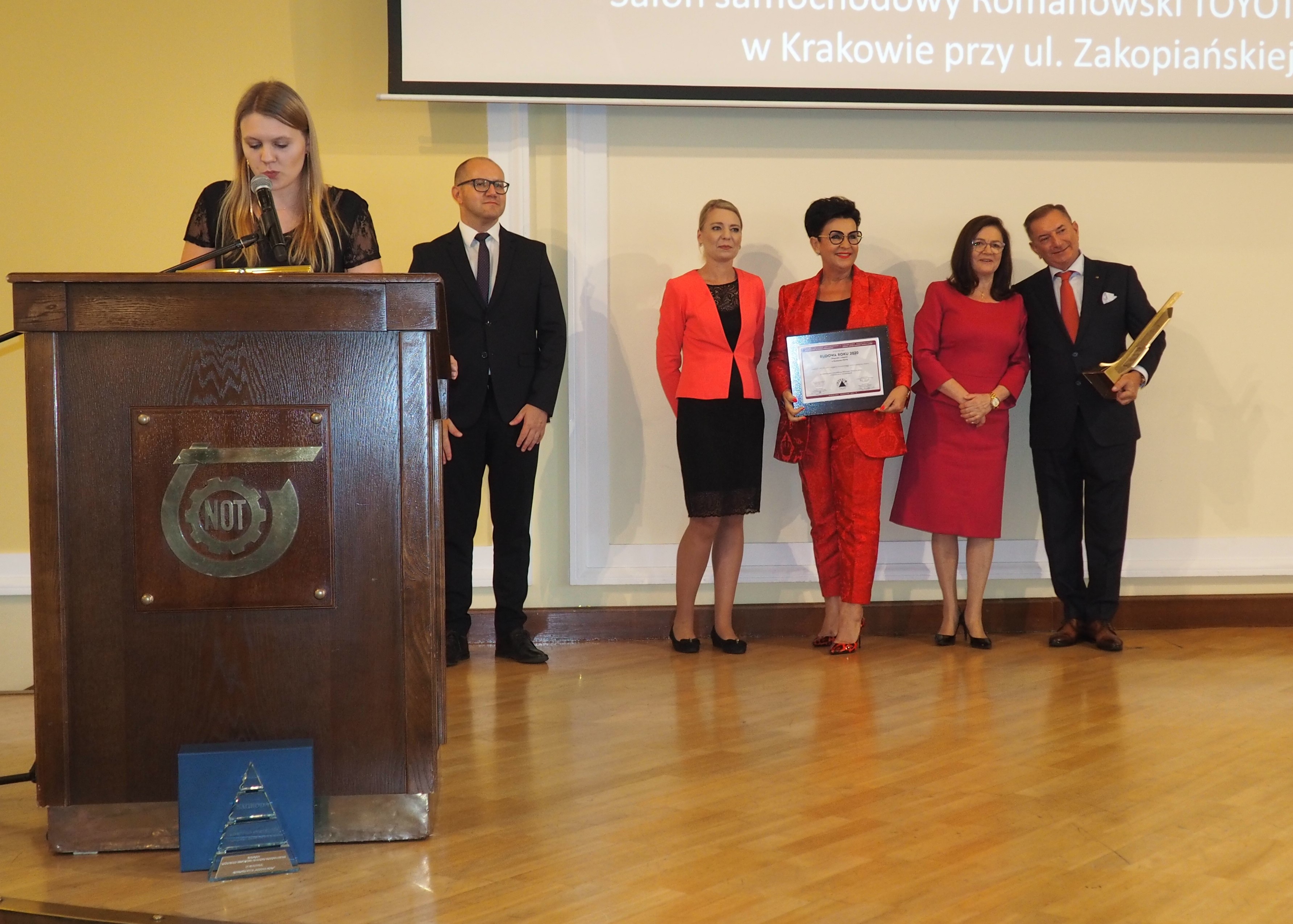 Podczas Gali Pani Dorota Cabańska wręczyła na ręce Pani prof. Marii Kaszyńskiej Przewodniczącej Polskiego Związku Inżynierów i Techników Budownictwa oraz Pana Radosława Sekundy, Przewodniczącego Komitetu Organizacyjnego Konkursu „Budowa Roku” nagrodę Głównego Inspektora Nadzoru Budowlanego.