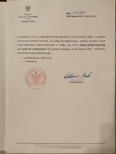 14 października 2022 r. Dorota Cabańska, Główny Inspektor Nadzoru Budowlanego, podczas uroczystych obchodów Dnia Budowlanych, otrzymała z rąk Piotra Uścińskiego, Sekretarza Stanu w Ministerstwie Rozwoju i Technologii, odznakę honorową „Za zasługi dla budownictwa”.