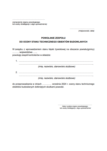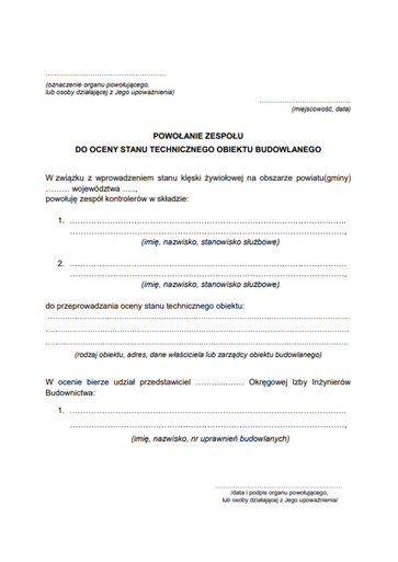 Każdy z zespołów posiada: "Powołanie zespołu do oceny stanu technicznego obiektu budowlanego." Na żądanie inspektorzy mają obowiązek je okazać.