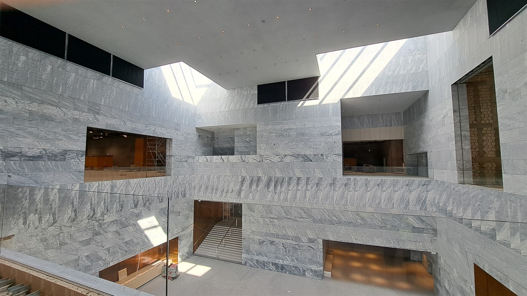 Marmurowa elewacja nawiązuje do kolejnych warstw naszej historii: od czasów najdawniejszych, do współczesności. Na kamiennych płytach widać reliefy, które odnoszą się do wybranych symboli polskiej architektury. Można na nich zobaczyć m.in. Drzwi Gnieźnieńskie i dwudziestowieczne przykłady modernizmu. Zwieńczeniem budynku jest taras widokowy, z którego rozpościera się widok na panoramę Warszawy.
