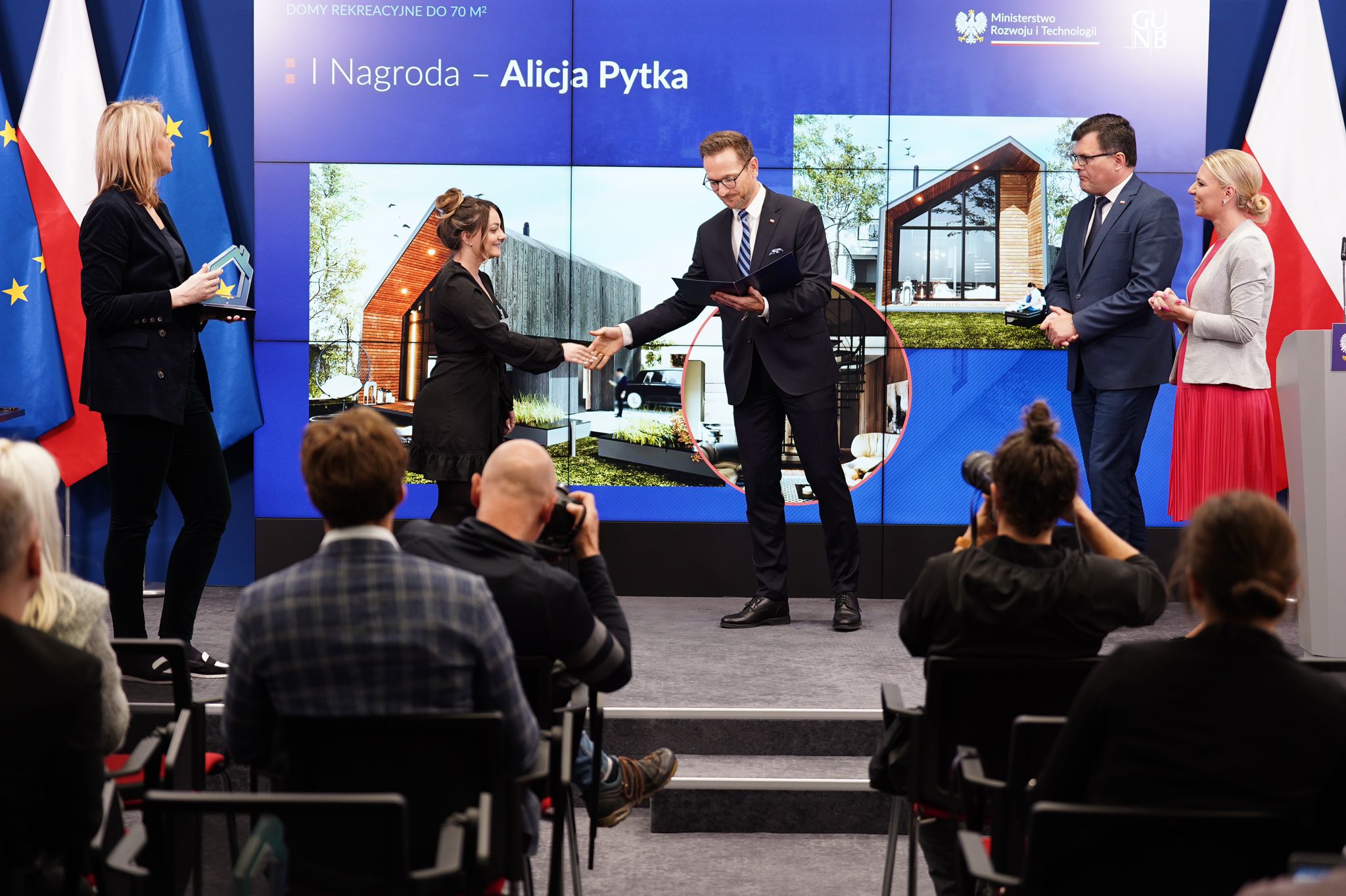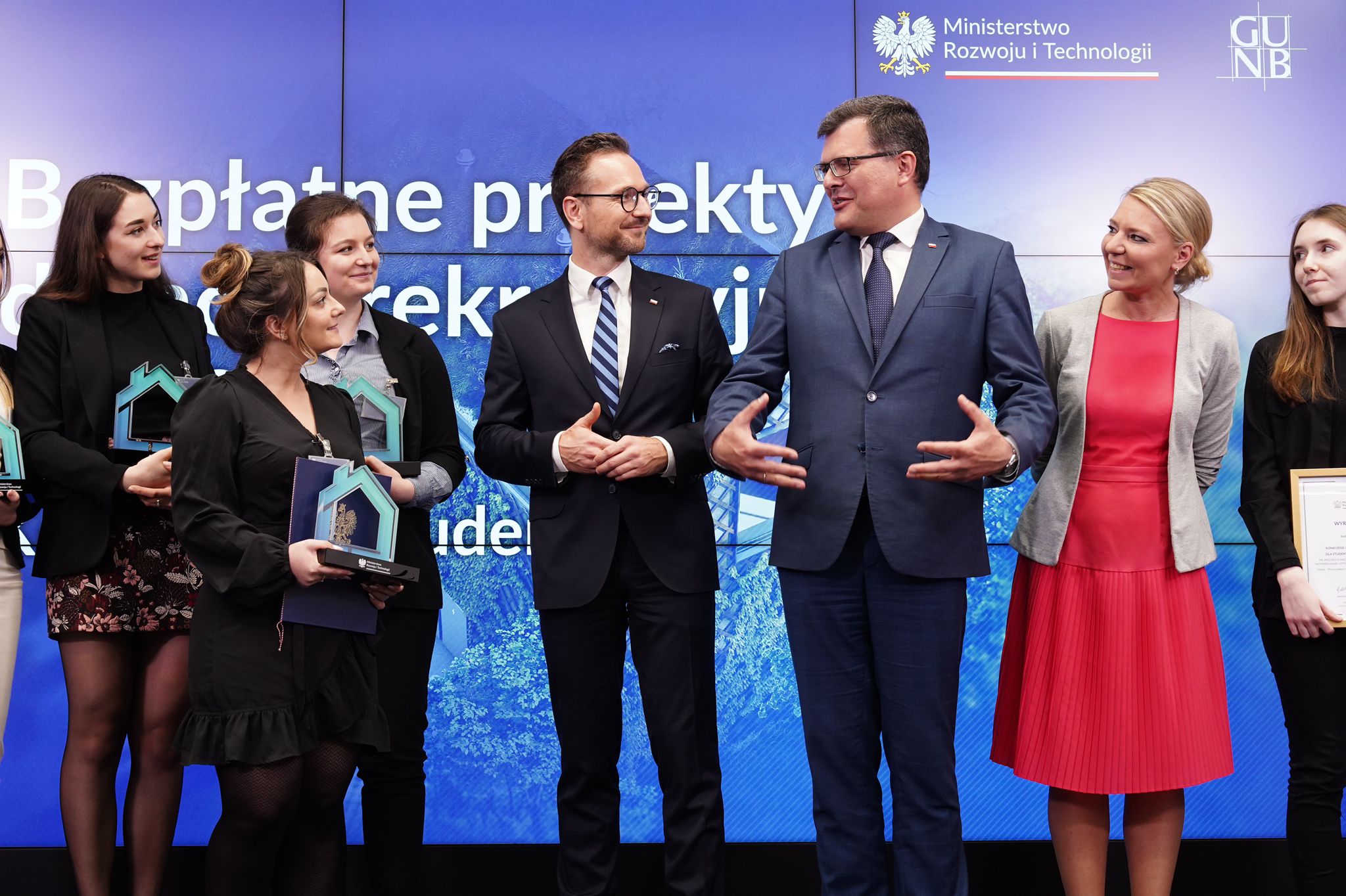 Minister Waldemar Buda, wiceminister Piotr Uściński oraz Główna Inspektor Nadzoru Budowlanego Dorota Cabańska wręczyli dziś w MRiT nagrody w studenckim konkursie architektonicznym „Małe budownictwo – duże korzyści”.