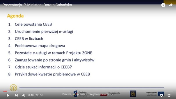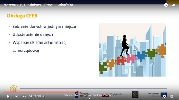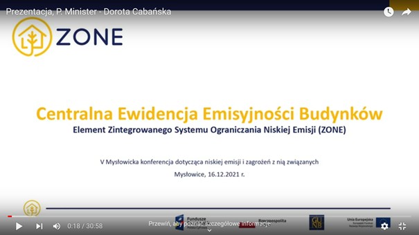 Funkcjonowanie CEEB i jej główne założenia zaprezentowała szeroko i omówiła Dorota Cabańska, p.o. Głównego Inspektora Nadzoru Budowlanego w części: "Centralna Ewidencja Emisyjności Budynków. Element Zintegrowanego Systemu Ograniczania Niskiej Emisji (ZONE)." W swoim wystąpieniu poruszyła następujące tematy: